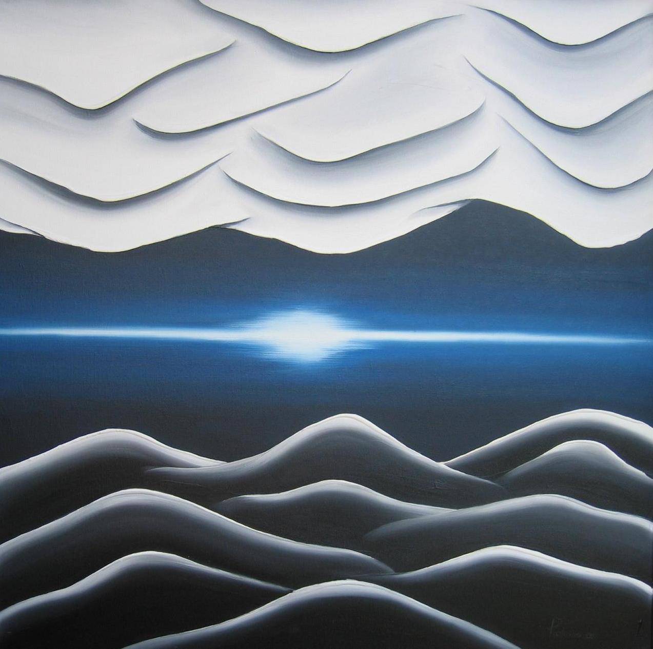 Ten obraz to prawdziwe arcydzieło kontrastów i cieni. Stonowane odcienie niebieskiego, bieli i czerni współgrają ze sobą, tworząc dynamiczną, choć spokojną kompozycję. Fale śnieżnych pagórków wiją się niczym leniwie przemieszczające się chmury, a ich krzywizny przypominają falującą wodę. Pośrodku jaśnieje linia światła, jakby to była granica między dwoma światami. Artysta zastosował technikę delikatnego rozmycia, nadając całości miękkości i subtelnej lekkości. Atmosfera obezwładnia spokojem, ale i intryguje niewyraźnym pięknem. To taki obraz, który można oglądać bez końca, odkrywając w nim coraz to nowe emocje. Patrząc na niego, można poczuć zarówno melancholię, jak i nadzieję na coś nowego. Minimalizm tego dzieła jest jego siłą. You could say it's mesmerizing. Czasami czuję się, jakbym patrzył na horyzont innego wymiaru. Myślę, że artysta chciał, byśmy zastanawiali się nad nieskończonością. Super, jakby się niebo spotkało z wodą, prawda? Ten obraz zdaje się szeptać do nas, mówić o tym, jak piękne jest życie w swojej prostocie i tajemnicy.