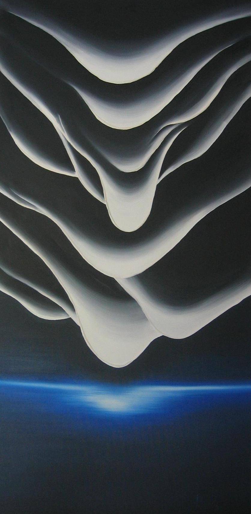 Obraz ukazuje tajemnicze, falujące formy przypominające eteryczne chmury, które unoszą się nad ciemnym tłem w odcieniach czerni i granatu. Kształty te, choć proste i miękkie, nadają dziełu swego rodzaju dynamikę. Światło bawi się z cieniem, tworząc subtelne przejścia między bielą a szarościami. W dolnej części obrazu niebieska poświata przyciąga wzrok, nadając całości aurę spokoju i niewypowiedzianego piękna. Za pomocą delikatnych pociągnięć pędzlem artysta tworzy atmosferę tajemnicy i spokoju, jakbyśmy wpatrywali się w niebo o zmierzchu. Styl obrazu przypomina surrealizm z nutą minimalizmu. Ciekawe, jak takie proste formy mogą wywoływać emocje, poczucie wewnętrznego wyciszenia, a nawet zadumy nad rzeczami większymi niż my sami. Ktoś mógłby pomyśleć: "To wygląda jak magiczne niebo!" Coś w tym jest, pewnie. To dzieło jest niczym surrealistyczny sen, misteriously przyciąga naszą uwagę. Może przywołać wspomnienie letnich wieczorów lub tęsknoty za nieznanym. Każdy, kto patrzy, może znaleźć coś własnego w tej miękkiej harmonii. To, co najbardziej zachwyca, to umiejętność artysty do uchwycenia esencji niewidzialnego.