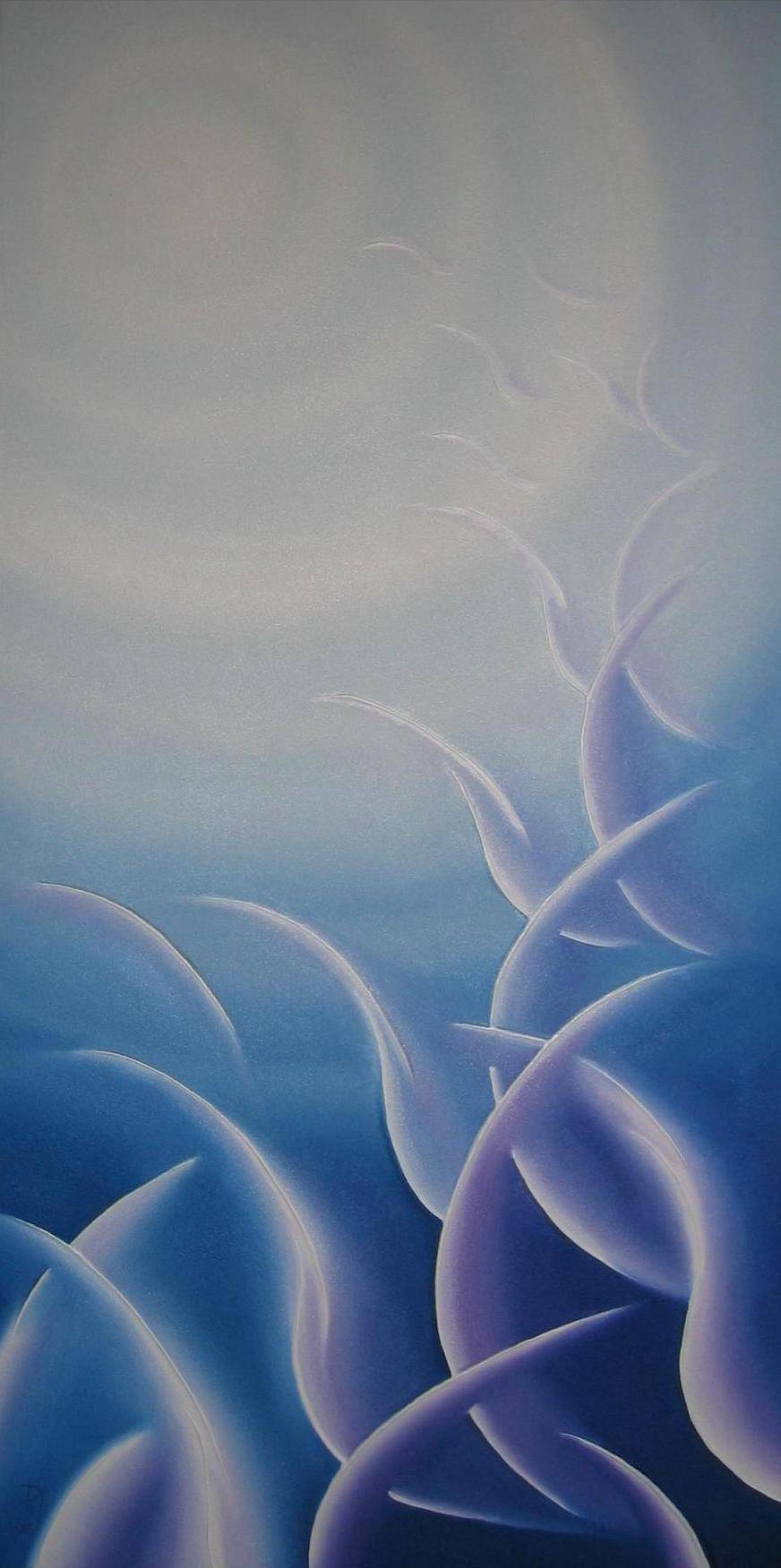 Obraz to prawdziwa uczta dla oka, zdominowana przez miękkie przejścia kolorów od błękitu po delikatne fioletowe odcienie. Kształty przypominają falujące liście lub zawijające się wstęgi, unoszące się jakby w tańcu w stronę nieba. Kompozycja jest harmonijna i płynna, jakbyśmy byli świadkami powolnego ruchu w sennej krainie. Atmosfera jest spokojna i medytacyjna, zachęcająca do zatrzymania się i kontemplacji. Obraz emanuje ciszą i marzycielskim spokojem, idealnym do chwili refleksji. Styl artysty jest niezwykle delikatny, można dostrzec wpływy art nouveau w kształtach i subtelnej kolorystyce. Technika, jaką zastosowano, to chyba airbrush, dając efekt niemal mglisty, jakby rzeczywistość była odbiciem w wodzie. Obraz może wywołać różnolite emocje, od spokoju po lekkie zadziwienie tajemniczością form. Może to być podróż do wewnętrznego "dreamland". Nie wiem jak wy, ale dla mnie to jak wpatrywanie się w chmury w leniwy, letni dzień. A teraz powiedziałbym, że to przypomina mi przedziwne jezioro, które zasnęło i nie chce się obudzić. Myślę, że nawet 7-letnie dziecko zobaczy w tych formach kawałek bajkowego świata. To takie incredible, jak sztuka może mówić do nas różnymi językami emocji. Cóż, magia prawdziwego artystycznego wyrazu.