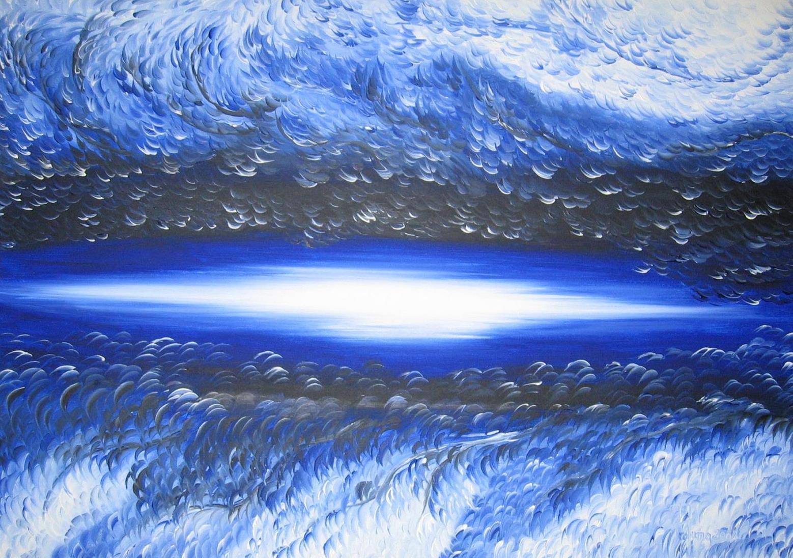 Na obrazie dominują odcienie niebieskiego, które przechodzą od jasnych, niemal świetlistych bieli po głęboki granat. Wygląda jak sztormowe niebo lub ocean pełen zawirowań. W środku kompozycji jasny, poziomy pas światła rozciąga się jak światło odbite od wody lub nieba. Całość składa się z licznych, dynamicznych pociągnięć pędzlem, przypominających kłębiące się fale czy chmury. Atmosfera obrazu jest pełna energii i ruchu. Styl, z którym można go porównać, to impresjonizm, lecz z nutą abstrakcji. Czy czujesz tę dynamikę i ruch? Wyobraź sobie te fale, jakby cię miały pochłonąć. Artysta zastosował technikę impasstu, nadając obrazie teksturę i głębię. Emocje, jakie wzbudza to mieszanka spokoju i niepokoju, jakby coś miało się wydarzyć. To ta chwila przed burzą, pełna napięcia, ale i przedziwnego piękna. I nagle: "Ale duże fale!", powiedziałby każdy mały chłopiec na plaży. Obraz zmusza do refleksji o sile natury. Może to przedstawiać chaos, ale i porządek, taki jaki tylko natura potrafi stworzyć. Wow, jakie to powerful! Całość jest jak sen, z którego jeszcze nie chcesz się obudzić. Fascynujące i poruszające, prawda?