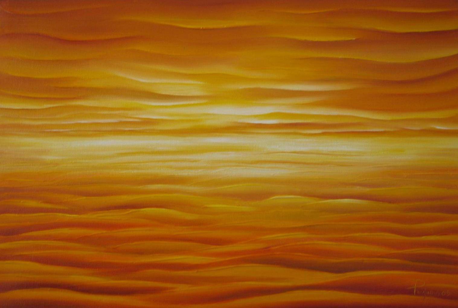 Na obrazie dominuje ciepła paleta barw, pełna odcieni złota, pomarańczu i lekkiego żółtego. Piękne rozmycie kolorów przypomina fale, które delikatnie zasypiają pod wieczornym niebem. Te miękkie linie zdają się wibrować i tętnić ciepłem zachodzącego słońca, tworząc iluzję ruchu. Przechodząc od jednego do drugiego, każdy kolor subtelnie przeplata się z następnym, tworząc harmonijną całość, która zdaje się otulać widza niczym ciepły koc. Obraz emanuje spokojem i kontemplacją. Atmosfera jest nieco nostalgic i przypomina o letnich wieczorach spędzonych nad morzem. To powolny taniec światła, który zachęca do refleksji. Technika artystyczna jest minimalistyczna, lecz niezwykle efektywna – artysta skupia się na esencji koloru i ruchu. Myślisz sobie: „Wow, jakie to proste i piękne!” Wpatrując się w obraz, można poczuć spokój i ciepło bijące z płótna. Może nawet chwilę zapomnieć o codziennych troskach. Patrząc na te delikatne fale, można poczuć, jak trud dnia ustępuje, zastąpiony przez ukojenie i nadzieję. Kolory są jak smaczne lody, yum! Widać tu mistrzowskie połączenie prostoty z głębokim uczuciem. Ten rodzaj sztuki sprawia, że serce bije nieco szybciej, a jednocześnie jest jak magiczne "chill" dla duszy. Obraz mógłby być dla wielu symbolem zachodu słońca, który wie, kiedy jest najlepszy czas na relaks.