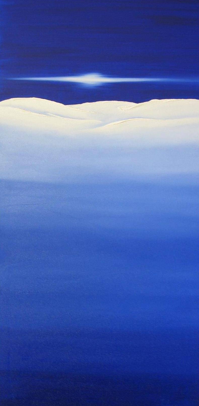 Obraz emanuje zimowym spokojem, ukazując subtelne przejścia między odcieniami błękitu a bielą śnieżnych zasp. Głębia ciemnego nieba kontrastuje z jasnymi, niemal niewinnymi tonami na dole, tworząc harmonijną kompozycję. Całość wydaje się jak sen, mroźny i niesamowicie spokojny. Widoczna linia światła przecina horyzont, przyciągając wzrok i zapraszając do refleksji. Styl minimalistyczny, w którym artysta operuje prostymi formami i ograniczoną paletą kolorów, przyciąga swoją oszczędnością. Użycie gładkich pociągnięć pędzla wspomaga poczucie spokoju i ciszy. Nawet moja siostra by tak mogła, mówiłem, gdy patrzyłem. Obraz ten może wywołać w odbiorcy uczucia nostalgii, spokoju, a jednocześnie pewnej tęsknoty. W pewnym sensie wyzwala poczucie "freedom", przestrzeni, w której można się zatracić. To jak zimowy wieczór, gdzie wszystko wydaje się być w idealnej równowadze. I choć na pierwszy rzut oka może wydawać się prosty, to im dłużej na niego patrzysz, tym więcej odkrywasz emocji i ukrytych znaczeń.