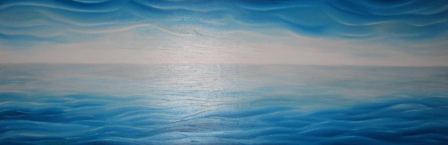 Na obrazie widać rozległą równinę oceanu, pokrytego falami w odcieniach błękitu, które tworzą przyjemnie płynącą kompozycję. Kolory są miękko zharmonizowane, od ciemniejszego indygo na dole po jasny, niemal biały horyzont. Ta harmonia barw nadaje obrazowi spokojny i kojący nastrój, jakbyśmy stali na brzegu i słuchali szumu fal. Artysta zastosował technikę rozmycia, co dodaje całości delikatności i subtelnego dynamizmu. To prawdziwy chill-out dla oczu! Atmosfera obrazu jest melancholijna, ale i pełna nadziei. Może przypominać letni dzień, kiedy słońce pomału chowa się za linią horyzontu, a ciepły wiatr owiewa twarz. Z jednej strony czuje się tęsknotę za nieskończonością morza, z drugiej – spokój, który przynosi każde spojrzenie na wodę. Można tutaj poczuć się "lost in thought". Nie mogę przestać myśleć, jak bardzo obraz ten oddziałuje na emocje. Może wywoływać refleksje o podróżach, marzeniach, a czasem po prostu o beztroskich chwilach. Dla mnie – to jakby zanurzenie się w morzu spokoju, prawdziwy safe haven. Mamo, to wygląda jak niebo w wodzie!
