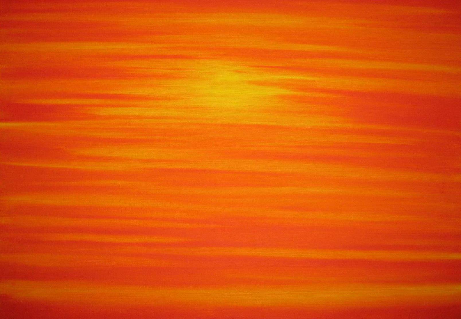 Obraz emanuje ciepłem i energią, jakbyśmy patrzyli na zachód słońca zamknięty w ramy płótna. Dominuje tu odcień pomarańczu, który przechodzi w subtelne pasma żółci. Tak jakby ktoś rozlał złote światło na płótnie. Na pierwszy rzut oka, wydaje się, że na obrazie nie ma wiele skomplikowanych kształtów, a jednak całość ma hipnotyzującą harmonię. Ten gradient barw, przypomina mi letnie wieczory i chwile spędzone na plaży. Atmosfera obrazu jest spokojna, niemalże medytacyjna, ale to ciepło i intensywność barw dodają mu pewnej dynamicznej energii. Patrząc na niego, można poczuć się trochę jak po długiej kąpieli słonecznej. Wiem! To słońce! Techniki użyte przez artystę zdają się być proste, ale efekt jest magiczny. Przecieranie farb tworzy płynne przejścia między kolorami, co sprawia wrażenie ruchu i głębi. To, co najbardziej mnie urzeka, to emocje jakie wywołuje ten obraz. Może przywołać wspomnienia z wakacji lub chęć zatrzymania czasu. Emocje mogą być różne; od cichego ukojenia po entuzjastyczne pragnienie działania. Imagine standing in front of it and feeling the warmth. Obraz ten mówi o prostocie i pięknie, które często ignorujemy na co dzień. Czasem mniej znaczy więcej.