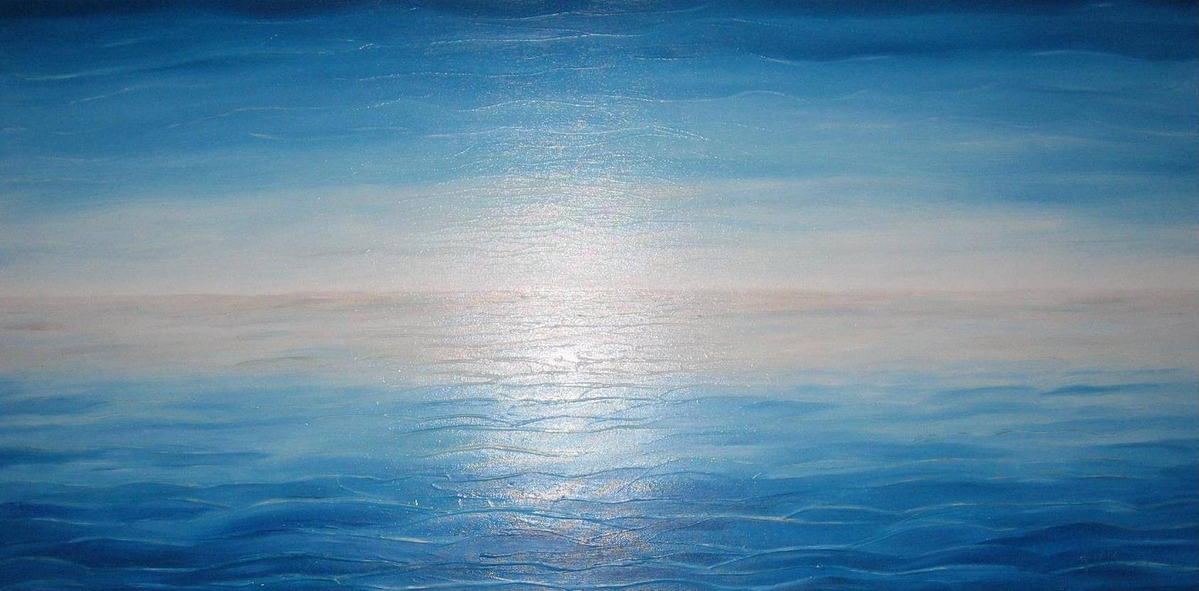 To dzieło to prawdziwa uczta dla oczu. Dominuje tu niebiański błękit, który przypomina o bezkresie morza i nieba. Kolory płynnie przechodzą od ciemniejszych odcieni na brzegach do jaśniejszych, niemal świetlistych tonów w centrum, gdzie światło odbija się na powierzchni wody. Ten efekt przypomina chwilę, kiedy słońce lśni na horyzoncie. Kompozycja jest schludna i symetryczna, co wprowadza poczucie spokoju i harmonii. Wydaje się, że czas tutaj stoi w miejscu, a przestrzeń rozciąga się w nieskończoność. Obraz emanuje spokojem i nostalgią. Sprawia wrażenie, jakby świat choć na chwilę stał się idealny. Malarski styl jest dość impresjonistyczny. Kreski farby układają się w delikatne fale, tworząc wrażenie ruchu mimo, że wszystko wydaje się nieruchome. To takie "calm before the storm", choć sztormu tu nie będzie. Odbiorca może poczuć lekką melancholię, ale i tęsknotę za chwilą zatrzymaną w czasie. "To jest jak niebo do góry nogami" - mogłoby powiedzieć 7-letnie dziecko, próbując uchwycić głębię przedstawionej sceny. Patrząc na ten obraz, czuję się jakbym unosił się na wodzie, bez trosk. Artysta zgrabnie balansuje między realnością a abstrakcją, zostawiając sporo przestrzeni dla naszej, indywidualnej interpretacji. Jak dla mnie, to dzieło aż prosi się o chwilę zadumy.
