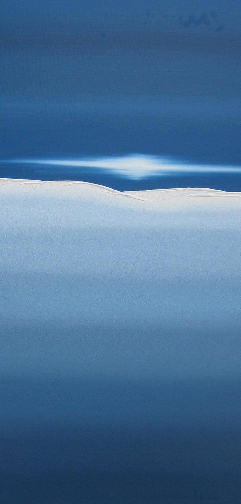 Obraz emanuje spokojem, jakby malarz chciał, abyśmy przenieśli się w świat ciszy i kontemplacji. Dominują błękity i biele, tworząc iluzję chłodnego poranka nad spokojnym morzem. Przestrzeń jest podzielona na płynne warstwy koloru, które układają się jak delikatne fale. Kształty są miękkie, a linie proste i harmonijne. Można by powiedzieć, że to jest taki "smooth" styl. Atmosfera jest niczym mgła, tajemnicza, ale jednocześnie jest jak ciepłe ręce mamy, które przytulają na dobranoc. Styl obrazu nawiązuje do minimalizmu. Artysta zastosował delikatne przejścia tonalne, co nadaje pracy subtelność i elegancję. Gdy patrzę na ten pejzaż, czuję spokój, jakby czas na chwilę się zatrzymał. Myślę sobie: "To tak jakbyśmy byli na wielkim, niebieskim lodowisku." Obraz może wywoływać refleksje na temat nieuchwytnej natury piękna. Budzi emocje jak miłe wspomnienia, które wracają w najmniej spodziewanych momentach. To prawdziwa poezja zamknięta w barwach i formach, elegancja, która trafia prosto w serce i nie chce się stamtąd ruszyć.