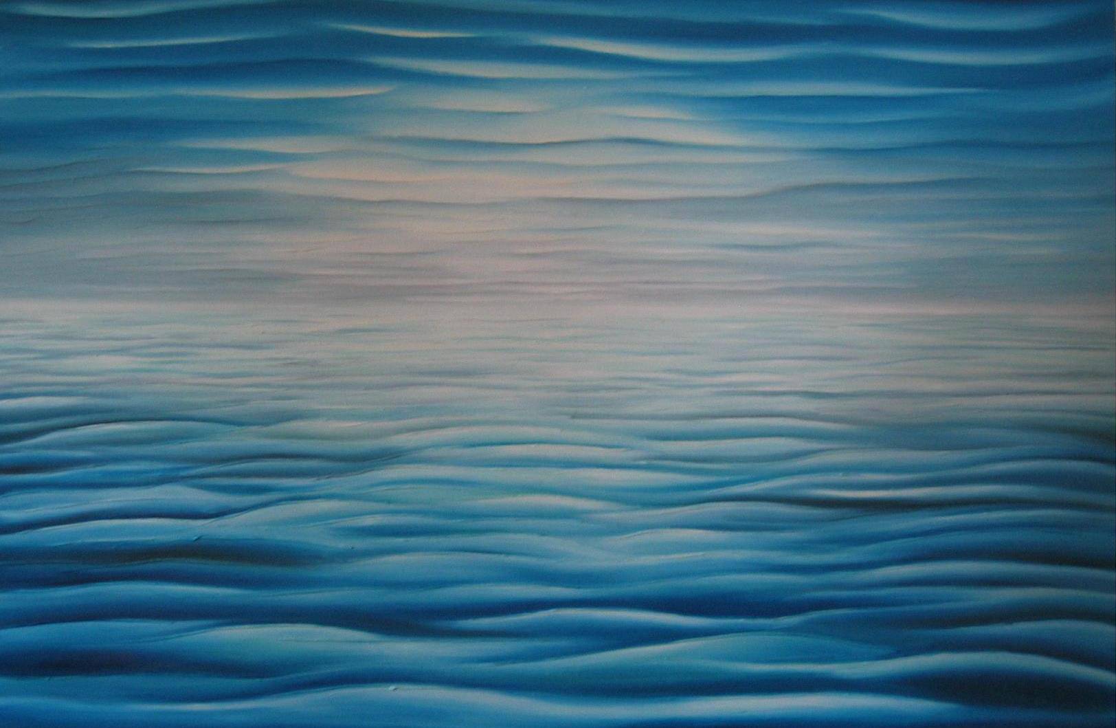 Obraz ukazuje delikatną dynamikę falujących niebieskich tonów, które przenikają się nawzajem z subtelnym przejściem kolorów, jakby niebo złączyło się z oceanem. Całość utrzymana w odcieniach błękitu i szarości przywodzi na myśl morski bezkres, nieco zamglony i tajemniczy. Kształty przypominają fale, które suną leniwie, tworząc spokojną, a zarazem melancholijną atmosferę. Ten spokój i monotonia niosą ze sobą niezwykły nastrój refleksji. Czuję się, jakbym patrzył na ocean, który nigdy się nie kończy, a jego milcząca opowieść jest niezmiennie fascynująca. Artysta postawił na minimalizm, używając technik mieszania kolorów, co dodaje głębi i przestrzeni. Te fale mogą być pociągnięciem pędzla olejną farbą, które przenika przez płótno z precyzją i artyzmem. Look, mamo, to jak morze w lato! – opisałby ten obraz dzieciak, widząc w nim swoją wersję bezkresu. Każdy widz znajdzie tu coś innego. Czas płynie wolniej, a przyglądając się, odnajdziemy chwile zadumy. Doprawdy, ten obraz to podróż do miejsca, gdzie spokój i chaos istnieją obok siebie, a interpretacji może być tysiąc. Tutaj unoszę się myślami ku Tajemniczym Krainom Wyobraźni.