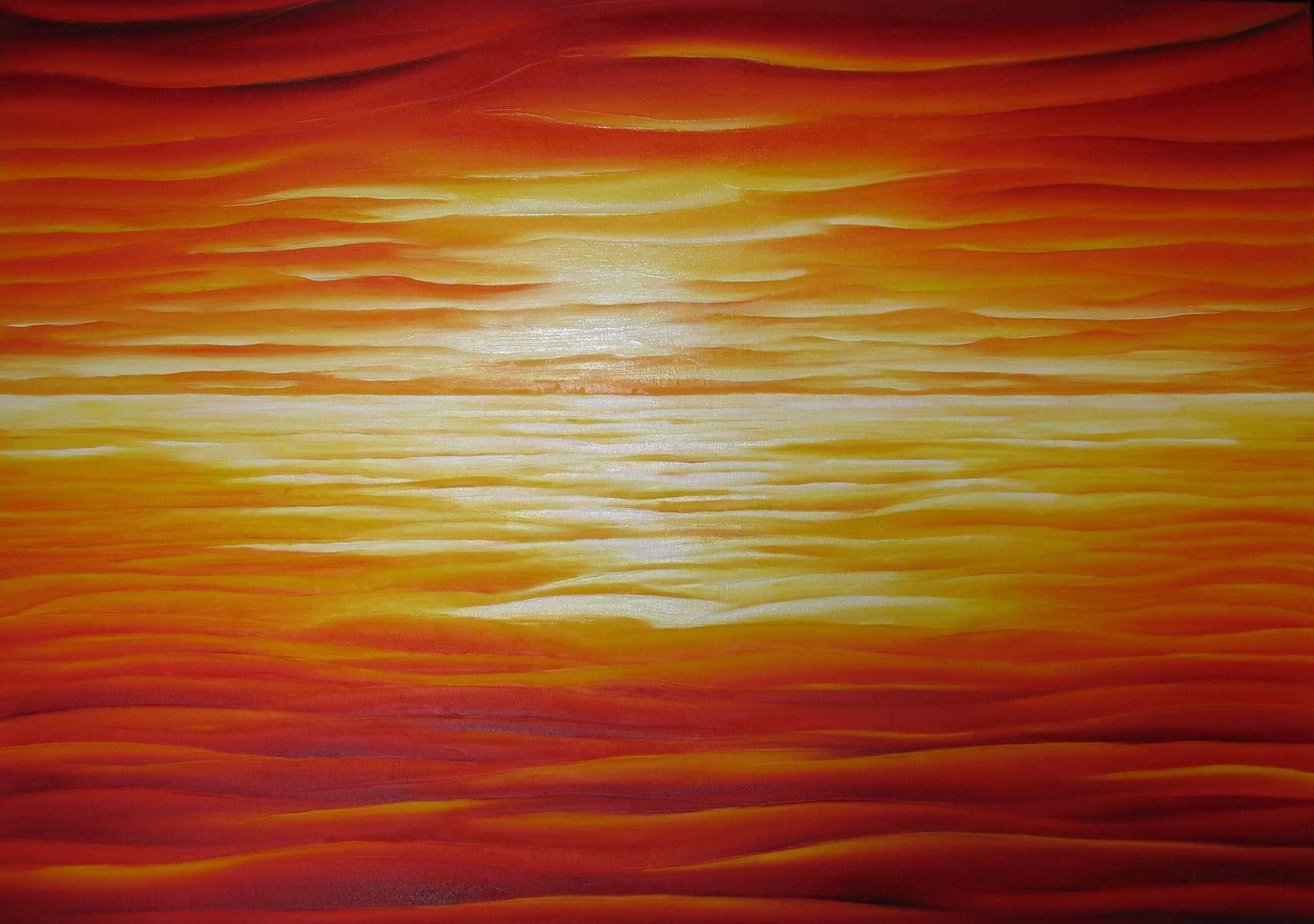Obraz przedstawia magiczny zachód słońca, gdzie dominują odcienie czerwieni, pomarańczu i złota. Fale koloru zdają się płynąć, jakby odbijały słońce chowające się za horyzontem. Ta feeria barw tworzy hypnotyzującą grę światła i cienia, której trudno się oprzeć. Kiedy patrzysz na to dzieło, czujesz, jak ciepło ogarnia Cię od stóp do głów. Atmosfera jest pełna spokoju i refleksji. Artysta użył płynnych pociągnięć pędzla, które tworzą efekt almost surrealistyczny. Kompozycja jest harmonijna, a równocześnie zaskakująco dynamiczna. Technika przypomina impresjonizm połączony z elementami sztuki abstrakcyjnej. W tej plątaninie kolorów nie sposób nie dostrzec ruchu, który wydaje się zapraszać do tańca z wiatrem. Dla wielu odbiorców ten obraz może wywoływać uczucie nostalgia, wspomnienie letnich wieczorów nad morzem. To jakby mała podróż w czasie, do miejsc pełnych szczęścia i beztroski. Kiedyś widziałem takie kolory na wakacjach z moimi rodzicami. Wydawały się bajkowe. To takie magiczne przeżycie, które zostaje na zawsze. Patrząc na to dzieło, nie sposób nie pomyśleć o ulotności chwil. Każda sekunda jest jak ten zmieniający się kolor nieba, nie do uchwycenia, ale tak piękny, że chce się patrzeć i patrzeć. To uczucie robi coś z sercem. Czy to może być rodzaj tęsknoty za czymś, co było szczęśliwe i spokojne?