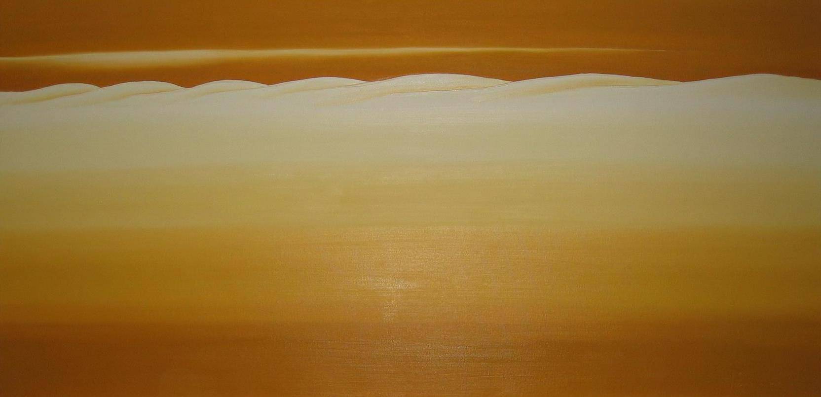 Obraz emanuje ciepłem i spokojem, a dominującą rolę odgrywają tu odcienie złocistego brązu i kremowej bieli. Kolory te przenikają się płynnie, tworząc łagodne przejścia, które przypominają bezkresną pustynię o zachodzie słońca. Kształty są miękkie, a kompozycja zdaje się być podzielona na wyraźne pasy, przypominające warstwy piasku. Ten minimalistyczny styl przywodzi na myśl technikę blendingu, co nadaje całości subtelny efekt mglistych marzeń. Wzrok przyciąga delikatność, uspokaja monotonia barw. To taki moment, kiedy stoisz na brzegu świata i czujesz się mały. Jak tafla jeziora o poranku, ten obraz otula ciszą, pozwala się zatrzymać, kontemplować. Hmm, trochę jak "peace" dla duszy. Może niektórym przypomni nostalgiczne chwile na spokojnej plaży, kiedy słońce chowa się za horyzontem, zostawiając niebo zalane złotem. Obraz może wywoływać w odbiorcy uczucie harmonii i retrospekcji, skłaniając do refleksji nad spokojem natury i pięknem chwili. Tak jakby artysta chciał wyrazić, jak ważne jest docenianie prostoty i odnajdowanie radości w małych rzeczach. To po prostu piękne i tak fajnie się na to patrzy.