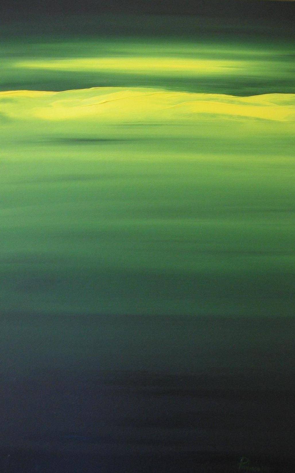 Obraz jest jak sen zieleni – od jasnych, prawie neonowych pasm aż po głębokie, ciemne zielenie. Stykają się tu różne odcienie, tworząc przyjemną dla oka mozaikę, która zaprasza do refleksji. To jak patrzenie na spokojną wodę, gdy promienie słońca migoczą na jej powierzchni. Kompozycja jest prosta, ale niezwykle efektowna. Artysta wykorzystuje subtelne przejścia między barwami, co sprawia, że całość emanuje spokojem i harmonią. Dominujący nastrój obrazu to spokój. Można poczuć ukojenie, jakby wszystko na chwilę zwolniło. Czy to nie jest właśnie to, czego często szukamy w codziennym pędzie? Ta abstrakcyjna forma pozwala nam na własną interpretację. Jedni mogą widzieć tu krajobraz, inni emocje – na przykład poczucie spokoju po dniu pełnym chaosu. Artysta korzysta z techniki, która przypomina delikatne rozmycie, dodając głębi. Efekt można opisać jako 'soothing'. Dorosły widz może zatrzymać się przy tym obrazie na długo, odkrywając w nim coraz to nowe warstwy emocji. Nawet dziecko powiedziałoby: "To trochę jak łąka świecąca w nocy". Takie dzieło przypomina nam, jak ważne jest zatrzymanie się i docenianie prostych pięknych chwil w życiu.
