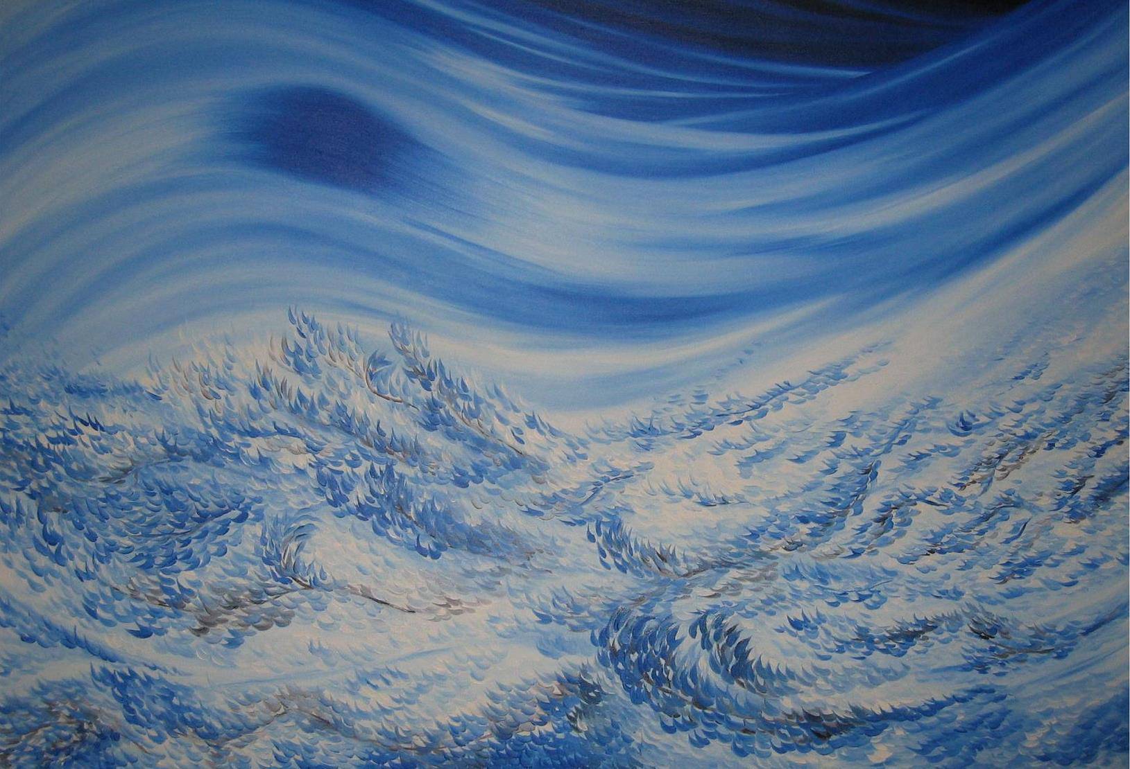 Na obrazie dominują odcienie niebieskiego, tworząc fale i wiry, które przypominają burzliwe niebo lub wzburzone morze. Kompozycja jest dynamiczna, z pędzącymi liniami i zakrętami, które nadają obrazowi życie. Krótkie maźnięcia pędzla układają się w liściaste kształty, przywołując na myśl ruch i chmury. Atmosfera emanuje spokojem i tajemnicą, jakby coś magicznego działo się tuż przed naszymi oczami. Jest w tym pewna głębia, którą trudno opisać słowami. Artysta zastosował techniki impasto, nadając teksturze obrazu trójwymiarowości. To trochę przypomina dreamscape, gdzie rzeczywistość zderza się z fantazją. Obraz wywołuje gamę emocji. Patrząc na niego, czuję pewien oniryczny spokój, ale i nutkę niepokoju. Jakby coś się działo pod powierzchnią. Jeee, ja też narysowałem kiedyś taką dużą falę. Można powiedzieć, że to dzieło ma w sobie coś z żywiołu, którego nie da się okiełznać. Jest jak ocean myśli, które przelewają się bez końca. Możesz się zatracić w tych odcieniach niebieskości, jakbyś płynął w nieznane. To intryguje, a zarazem uspokaja, zaprasza do zanurzenia się głębiej. Fascynuje ten kontrast między spokojem a dynamizmem. Kawałek sztuki, który sprawia, że zatrzymujesz się na chwilę i myślisz: "wow".