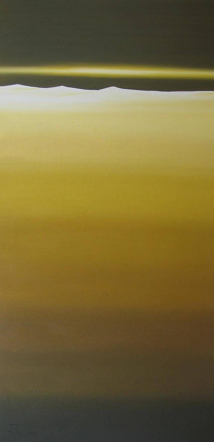 Obraz emanuje spokojem. Dominuje paleta ciepłych, złotych odcieni, które przechodzą subtelnie w ciemniejsze brązy na dole płótna. To jak senne pejzaże w krainie marzeń. Dominują tu prostokątne formy, które przypominają leniwie rozciągnięte horyzonty. Kompozycja jest niezwykle symetryczna, co dodaje obrazowi harmonii. Technika tego dzieła to prawdopodobnie technika olejna, a być może również delikatne użycie aerografu do stworzenia płynnych przejść kolorów. Artysta zastosował minimalistyczny styl, skupiając się na kolorze i jego emocjonalnym ładunku. Widz może odczuwać spokój i medytacyjną ciszę, niczym podczas ciepłego zachodu słońca. Ta atmosfera przypomina letni wieczór, gdy czas zwalnia. Mały Janek mógłby powiedzieć: "To wygląda jak wielka, złota pustynia bez końca". Obraz ten prowokuje do zanurzenia się w myślach, do refleksji nad upływem czasu. Patrząc na te złote pasma, można niemal poczuć delikatne muśnięcie wiatru. Wow, this painting really captures the essence of infinite calm. Magiczny, prawda? Taka prostota, a jednak pobudza wyobraźnię i zachęca do odkrywania własnych emocji.
