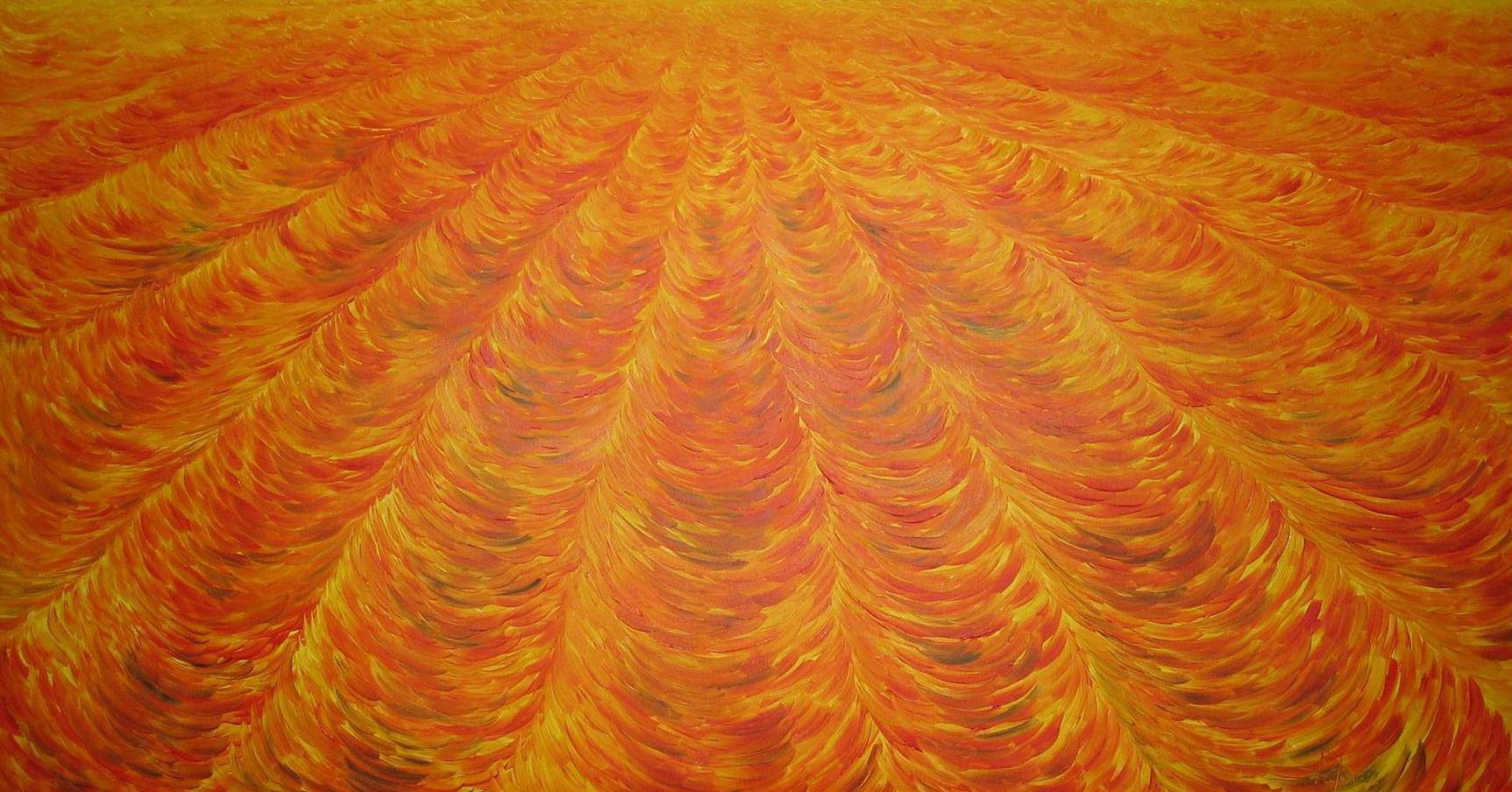 Na obrazie dominują intensywne odcienie pomarańczu i żółci, tworząc dynamiczny wzór przypominający pola pszenicy lub ogniste płomienie. Pociągnięcia pędzla układają się w fale, które zdają się płynąć i przekształcać się w nieskończoność. Artysta zastosował technikę impasto, nadając obrazowi teksturę i głębię, co sprawia, że niemal czuje się ciepło bijące z płótna. Atmosfera jest ciepła, niemal hipnotyczna, z nutą tajemniczości. To tak, jakby patrzeć na niebo podczas zachodu słońca, gdzie światło i kolory mieszają się w magiczny sposób. Obraz może wywoływać u odbiorcy poczucie spokoju, ale jednocześnie można odczuć też nieco niepokoju, jakby coś miało za chwilę się wydarzyć. hej, to wygląda jak ognista chmura! Wydaje mi się, że artysta chciał uchwycić esencję natury i przemijającego czasu. To naprawdę inspirujące, a dodanie elementu "motion" sprawia, że dzieło staje się jeszcze bardziej wciągające. Czasami odnosi się wrażenie, że każdy patrzący widzi w obrazie coś innego – coś tylko dla siebie.