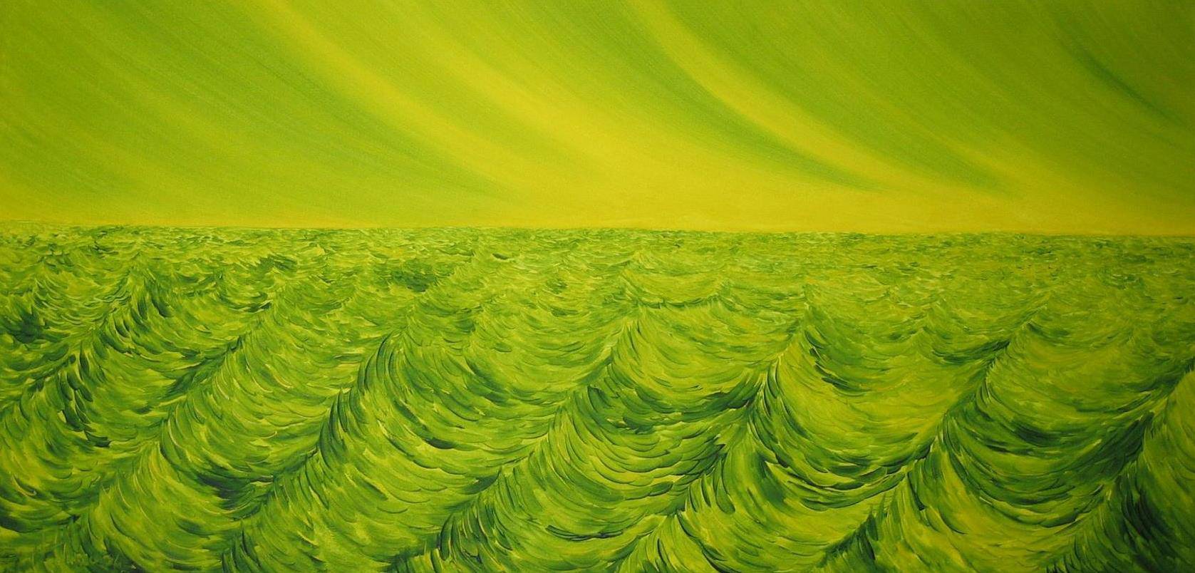 Obraz emanuje intensywną zielenią, która zdaje się wciągać widza w surrealistyczny świat. Rozciągające się fale, wyraziście pociągnięte na płótnie, przypominają rytmiczny taniec trawy na wietrze. Wzór i kierunek pociągnięć pędzla tworzą dynamiczną kompozycję, która jednocześnie uspokaja i wprowadza w trans. Niebo, niemal zlewające się z oceanem zieleni, dodaje dziełu głębi i perspektywy. Ten obraz to jak sen o nieskończonych polach, w których można się zagubić i odnaleźć. Ma w sobie trochę magii i sporo tajemnicy. Artysta używa impastu, co nadaje powierzchni fakturę i życie. Wyrażając minimalistyczny, lecz pełen emocji styl, dzieło oddziałuje na odbiorcę różnorodnie. Może wywoływać uczucie spokoju, ale i nutę niepokoju. Trochę jak spacer w nieznane. Ciekawe, jak one pokrywy fal poruszają się bez końca. To jak ocean czasu, który płynie. I love how the waves seem to tell their own stories. Obraz ten zachęca do refleksji, marzeń i odkrywania. Każdy dostrzega w nim coś innego, swojego.