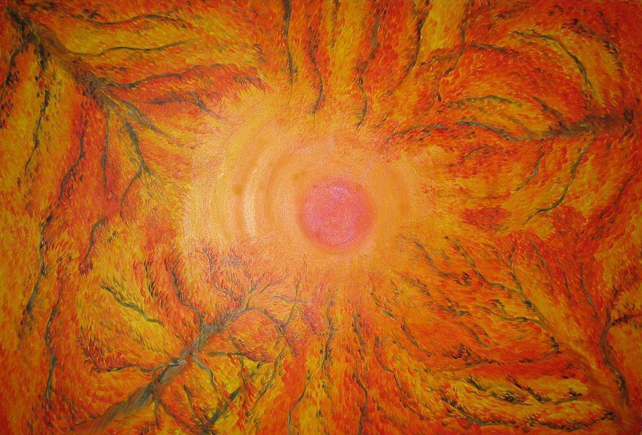 Ten obraz eksploduje kolorami przypominającymi jesienny spektakl przyrody. Dominują tu odcienie pomarańczu, żółci i czerwieni, które wirują niczym liście na wietrze, koncentrując się wokół jaśniejącego centrum. Kompozycja przywodzi na myśl wirujące słońce lub żarzący się ogień, który przyciąga wzrok swoją intensywną jasnością. Atmosfera jest dynamiczna i żywa, pełna energii wręcz elektryzującej. Styl tego dzieła odzwierciedla technikę impastową, gdzie grube nałożenie farby tworzy fakturę niemalże trójwymiarową. Artysta zdaje się malować z rozmachem, jakby pędzel był przedłużeniem jego emocji. To malowidło sprawia, że czuję się jakbym dostał łaskotki od słońca. Dziwne, prawda? Obraz emanuje ciepłem i energią, wywołując uczucie zachwytu oraz swoistego niepokoju. Tak jakby przyroda miała moc stawiania na nogi i skłaniania do myślenia. Aspekt „fire” jest tu zniewalający i można śmiało powiedzieć, że patrzenie na to cudo to jak patrzenie w głąb bijącego serca natury. Czym to zaskakuje odbiorcę? Hmm, może przypomina o cykliczności życia, jak każdy dzień prowadzi do nocy, a każda jesień do zimy. Dla mnie to przypomnienie, że chwila jest ulotna i piękna.
