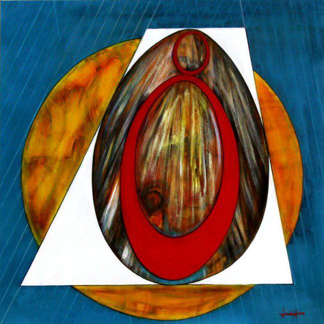 Obraz przyciąga uwagę geometrycznymi kształtami i żywymi barwami. Dominującym elementem jest owalny, drewnopodobny kształt, otoczony wyrazistym, czerwonym konturem. Kompozycja jest zestawiona na tle trójkąta, co przypomina nieco artystyczne origami. W tle dostrzegamy koło w ciepłych odcieniach żółci i pomarańczy, kontrastujące z chłodnym, niebieskim tłem. Ta feeria kolorów tworzy dynamiczny mix, który z jednej strony uspokaja, z drugiej, budzi ciekawość. Atmosfera obrazu jest jednocześnie enigmatyczna i nowoczesna. Obserwując go, można poczuć jakąś nostalgiczną nutę, a zarazem radosne "wow" odkrywania czegoś nowego. Styl artysty jest pełen ekspresji, z wykorzystaniem techniki mieszanych mediów. Linie są precyzyjne, a wybór kolorów sugeruje pewną spontaniczność i odwagę, typical dla współczesnych dzieł. Obraz może budzić intrygujące emocje. Może to być poczucie harmonii lub chaotycznej natury ludzkich emocji. "To wygląda jak jajko w wielkim kółku" - pomyślałby zapewne siedmiolatek. Widok ten zaprasza do refleksji nad naturą form i ich symboliką. W mojej osobistej opinii, obraz łączy w sobie elementy klasycznej elegancji z nowoczesnym twistem. To dzieło pozostawia widza z uczuciem spełnienia, ale także z nieodpartą chęcią powrotu do dalszej kontemplacji.