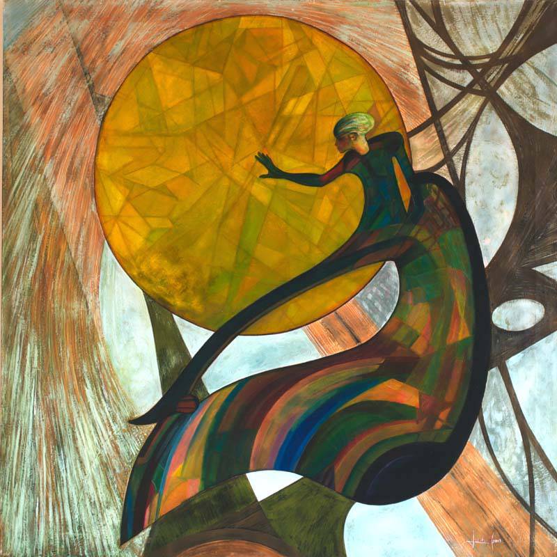 Na obrazie dominują ciepłe barwy: intensywne odcienie złota i zieleni, które kontrastują z chłodniejszymi tonami brązu i bieli. Centralnym punktem jest postać, która zdaje się niemal płynąć w przestrzeni, ubrana w długą, falującą szatę. Towarzyszy jej wielkie, geometrzyczne koło w tle, przypominający słońce lub tarczę. Kompozycja jest dynamiczna, a linie mocne i krzywe, co nadaje ruchu całej scenie. Styl przypomina trochę secesję – z wyraźnym naciskiem na dekoracyjność i finezję formy. Obraz emanuje tajemniczością i intensywnością. Jest w nim coś z magicznego, nieodgadnionego snu. Artysta z pewnością eksperymentował z formą, co zaskakuje i przyciąga uwagę. Wydaje się, że technika łączy elementy rysunku i malarstwa, wykorzystując grę światła. Patrząc na obraz, można poczuć zachwyt i zaciekawienie. Coś jak "wow, jaka przygoda!" Emocje, które budzi, to mieszanka spokoju z nutką niepokoju. Każdy może tu znaleźć swoją własną, unikalną interpretację. Jedno jest pewne – to dzieło nie daje się łatwo zapomnieć. Gdy patrzysz na niego dłużej, odkrywasz nowe szczegóły, które wcześniej mogły umknąć. A te kolory? They are simply mesmerizing.