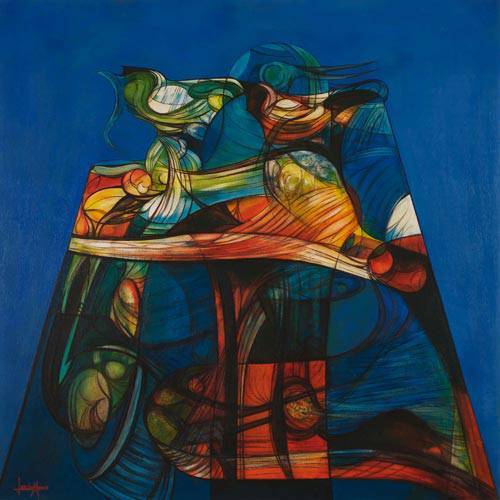 Obraz pełen jest barwnych wirów i form o nieregularnych kształtach, które wciągają spojrzenie swoimi intensywnymi kolorami. Dominują głębokie odcienie niebieskiego, przenikające się z jaskrawą czerwienią, zielenią i żółcią. Kompozycja jest dynamiczna, jakby artysta chciał uchwycić chwilę ruchu, wywołując wrażenie tajemniczej tańczącej energii. Atmosfera obrazu jest pełna napięcia, ale jednocześnie fascynująco spokojna. Można tu dostrzec abstrakcyjny styl, gdzie kreski i plamy tworzą coś pomiędzy chaosem a harmonią. Przyglądając się bliżej, można poczuć jak artysta bawi się formą i kolorem, malując techniką, która przypomina nieco kubizm z odrobiną ekspresjonizmu. Ta mieszanka stylów sprawia, że obraz emanuje złożonymi emocjami. Wzbudza ciekawość i zachęca do oddania się swojej wyobraźni. „Wow, ale te kolory są ładne!” – mógłby powiedzieć każdy malec. Dzieło wzbudza refleksję nad tym, jak czasem chaotyczny świat potrafi tworzyć coś pięknego. Obraz ma w sobie coś magic. Coś, co trudno uchwycić słowami, ale sprawia, że chcemy na niego patrzeć bez końca. Odbiorca może poczuć się zaintrygowany i jednocześnie odprężony. To sztuka, która zaprasza do własnych interpretacji.
