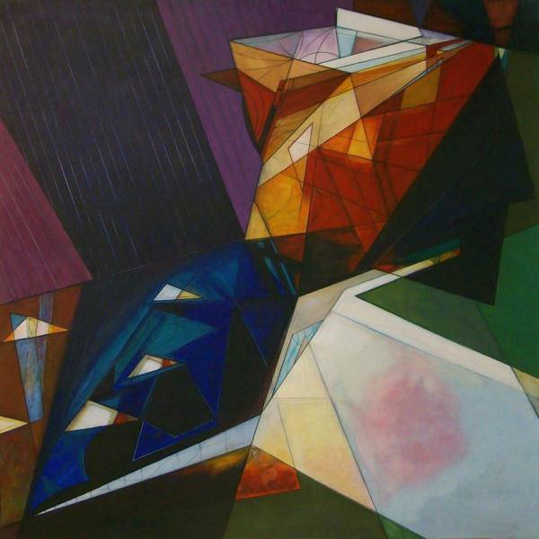 Obraz fascynuje mozaiką prostokątów i trójkątów, komponowanych w abstrakcyjną całość. Kolory są intensywne, z przewagą głębokiego granatu, soczystej czerwieni i ciepłych odcieni pomarańczy. Całość przypomina kalejdoskop, w którym każdy element łączy się w dynamiczną, choć przemyślaną kompozycję. Atmosfera? Z jednej strony tajemnicza, jakbyśmy zagłębiali się w nieznany świat, z drugiej - niemalże energetyczna, z nutą chaosu. Styl wyraźnie nawiązuje do kubizmu, przypominając dzieła Picassa ze swoją geometryczną precyzją. Technika artystyczna? To przede wszystkim gra światła, które przenika przez ostre krawędzie. Patrząc na obraz, można poczuć się jak odkrywca poszukujący znaczenia w chaosie form. Dzieło wywołuje różnorodne emocje. Jedni mogą poczuć się przytłoczeni intensywnością, inni odnajdą w nim spokój proporcji. Jest coś almost hypnotic w tych kształtach. Moja refleksja? Czuję, że to obraz, który można odkrywać w nieskończoność. „Wygląda jak dziwny domek!” - pomyślałby 7-latek. I coś w tym jest. Kiedy się przyglądam, mam ochotę wejść do środka i zobaczyć, co kryje się za następną ścianą barw i kształtów.