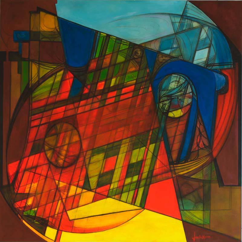 Obraz przyciąga wzrok intensywnymi barwami i zawrotną kompozycją. Dominują czerwienie, zielenie i błękity, które zdają się tańczyć w kalejdoskopowej scenerii. Geometryczne kształty - kwadraty, trójkąty, koła - przenikają się nawzajem, tworząc dynamiczną, niemal muzyczną harmonię. To, co widzę, to prawdziwy chaos, ale taki, który emanuje energią i nie pozwala oderwać oczu. Atmosfera jest pełna napięcia, to takie controlled chaos. Artysta zastosował techniki, które przypominają witraże z domieszką kubizmu, co nadaje dziełu nowoczesny, ale też nostalgiczny sznyt. Używa mocnych konturów, aby podkreślić kontrast między kolorami, a to sprawia, że obraz żyje, pulsuje. Patrząc na to, można poczuć radość, ale i niepokój. Jakby każdy kawałek układanki próbował opowiedzieć inną historię. Czuję się jak w nieskończoności - i to dobrą nieskończonością, taką dziecięcą wręcz radością odkrywania. "To wygląda jak kolorowe okna" napisałoby dziecko, i w sumie coś w tym jest. Mi ten obraz przypomina też muzykę, jakby każda linia i kolor były nutą w symfonii. Wow.