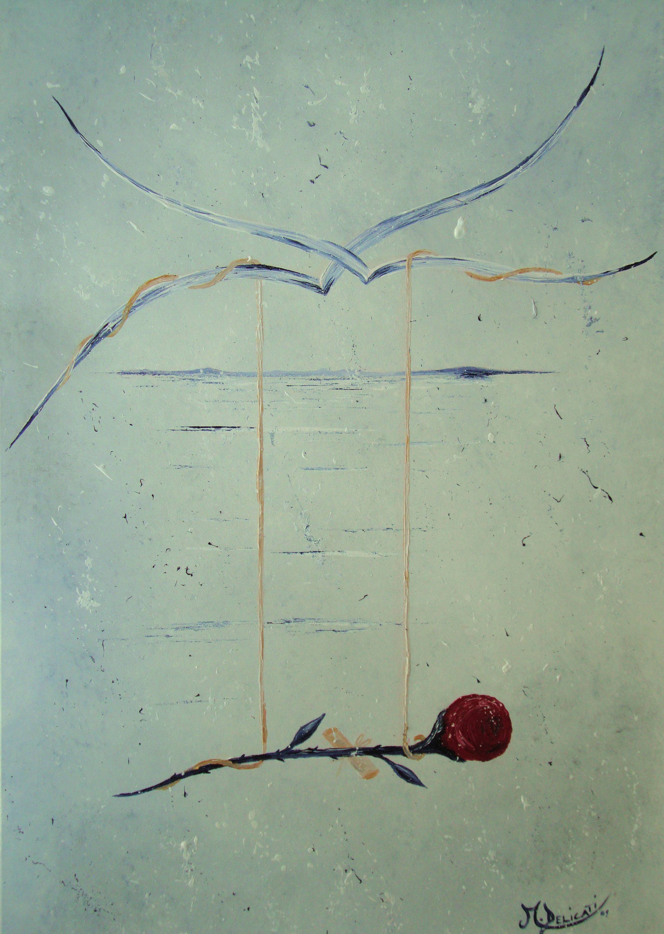 Obraz emanuje delikatnym urokiem, gdzie dominująca jest subtelna kolorystyka – pastelowe odcienie błękitu i szarości tworzą tło dla abstrakcyjnej kompozycji. Centralnym elementem są łagodnie zarysowane formy przypominające skrzydła, które przypominają o lekkości i wolności. Kontrastuje z nimi czerwona róża na dole, umocowana na cienkiej gałązce. Kompozycja obrazu jest minimalistyczna, lecz pełna symboliki. Nastrój dzieła wprowadza widza w stan spokoju i refleksji. Poprzez swoją prostotę obrazuje kruchość i piękno ulotnych chwil. Styl artysty jest niezwykle finezyjny, z wykorzystaniem technik impresjonistycznych i subtelnym podejściem do detali. Dzieło wywołuje we mnie uczucie melancholii. Myśli biegną ku chwiejności życia, ale też jego piękna. Róża, choć samotna, tętni pasją i życiem. Całość przypomina dream, w którym rzeczywistość miesza się ze snem. Siedmiolatek mógłby powiedzieć: to wygląda jak ptaszek, który przytula kwiatka. To malarskie dzieło zachwyca swoją prostotą i głęboką wymową.