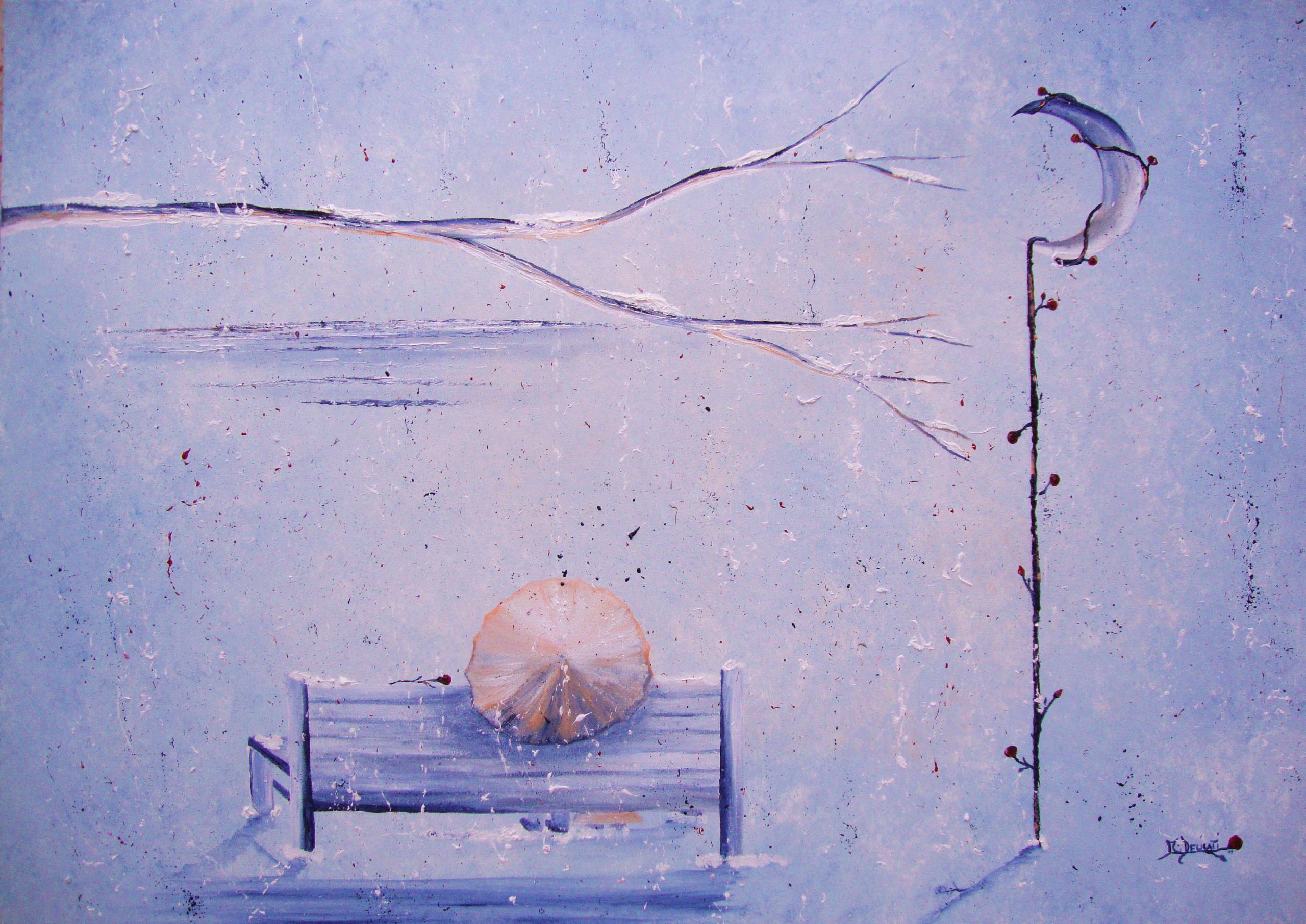 Obraz ukazuje minimalistyczną scenę w subtelnych odcieniach błękitu, z delikatnym akcentem bieli i różu. Gałąź z prawej strony obrazu unosi się elegancko ku niebu, przypominając unoszący się nad ziemią pędzel przypadku. Centralnie umieszczona ławka zdaje się czekać na kogoś, kto usiądzie, ale nie teraz. Teraz jest pusta. Na niej spoczywa różowy parasol, jakby zapomniany przez przechodnia—ojejku, wygląda jakby odpoczywał po długim spacerze. Całość kompozycji jest niczym melodyczny szept, minimalistyczna, ale intensywna. Artysta wykorzystuje technikę impastu do zaznaczenia faktury i głębi obrazu, co dodaje mu fizyczności. Styl zdaje się flirtować z abstrakcyjnym realizmem, przykuwając wzrok swoją prostotą. Atmosfera jest jak zimowy poranek, spokojna i melancholijna. Można poczuć lekkie ukłucie nostalgii, kiedy patrzysz na tę jasną przestrzeń. Czuć w tym jakby echo geniuszu. To właśnie ten calm, błogi spokój, który pozwala się zatrzymać choć na chwilę. Jaką historię ukrywa ten parasol? Kogo tam nie ma? Wzbudza emocje, pozostawiając nas z pytaniami i delikatnym uśmiechem na ustach.