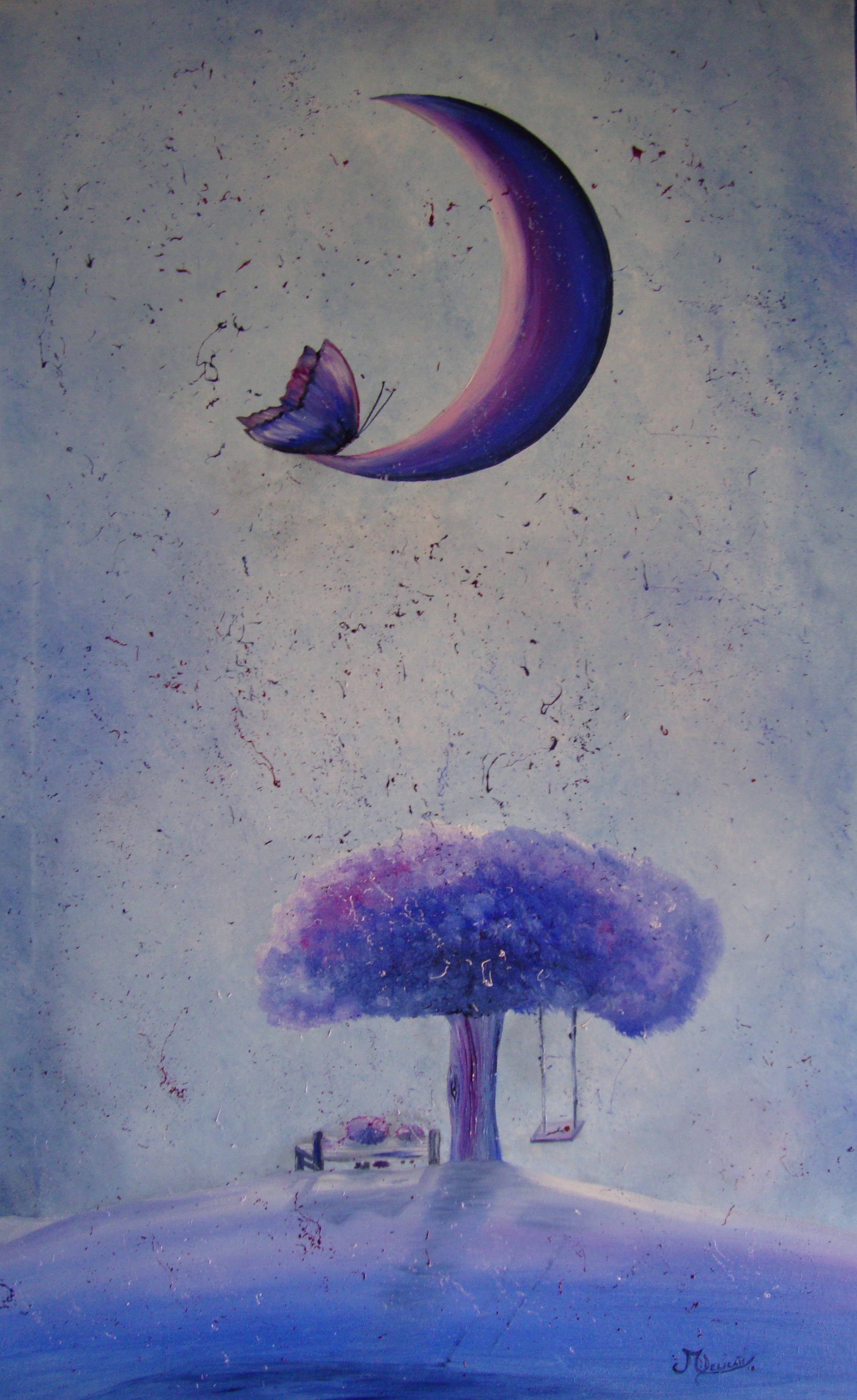 Na tym niezwykłym obrazie dominuje chłodny, niebieskawy odcień, który tworzy atmosferę tajemniczego spokoju. Na pierwszy plan wysuwa się księżyc w kształcie sierpa, otoczony fioletem i różem, z delikatnie zdobiącym go motylem. Całość zdaje się unosić w baśniowej przestrzeni, a obrazy we wróżkowe klimaty. Niżej widnieje samotne drzewo, rozłożyste i majestatyczne, z huśtawką, która czeka na kogoś, kto ją popchnie. Przytulna ławka pod drzewem kusi, by usiąść i zatopić się w marzeniach. Styl jest oniryczny, niemal surrealistyczny, z lekkim muśnięciem impresjonizmu. Farby olejne czy akryle, pewnie obie, igrają ze sobą, tworząc miękkie przejścia kolorów. Obraz przywołuje uczucie nostalgii, jakby gdzieś w pamięci szeptał zapomniane bajki z dzieciństwa. Dzieciak by powiedział: "Księżyc jest taki magiczny!" Utkana z nebulowych barw scena może skłonić do refleksji nad pięknem i kruchością marzeń. Dreamy, to słowo idealnie oddaje tę atmosferę. Trudno oderwać od niego wzrok, zawieszony gdzieś między światem realnym a krainą czarów.