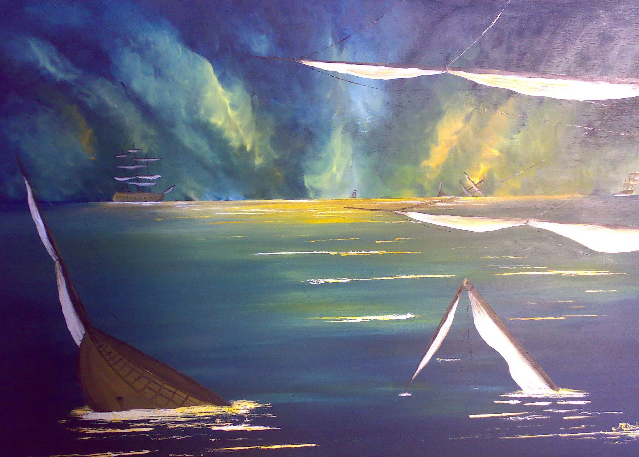 Obraz przyciąga wzrok intensywnymi barwami. Na pierwszym planie dominuje delikatna gra zieleni i granatu wody, przetykana żółtymi refleksami światła. Tło to spektakularny spektakl intensywnych żółci, zieleni i niebieskości, które przeplatają się jak ogniste niebo. Statki unoszące się na wodzie wprowadzają spokój i dynamikę jednocześnie. Kompozycja jest zrównoważona, z centralnym statkiem przyciągającym uwagę niczym bohater tej opowieści. Atmosfera obrazu jest tajemnicza i niemal magiczna, przypominając marzenia o dalekich podróżach. Styl artystyczny zdradza inspiracje impresjonizmem, gdzie gra światła i koloru odgrywa kluczową rolę. Emocje, jakie wywołuje to dzieło, to mieszanka zachwytu i tęsknoty za przygodą. To trochę jak patrzenie przez okno do innego świata, który jest równie realny, co nierealny. Here, you can almost feel the sea breeze on your face. Mój brat mówi, że to wygląda jak scena z piratami. Dla mnie to obraz o odkrywaniu nowych horyzontów, o odwadze, by wyruszyć w nieznane. Artyście udało się uchwycić esencję przygody, tę iskrę, która rozpala serca żeglarzy i marzycieli na całym świecie.