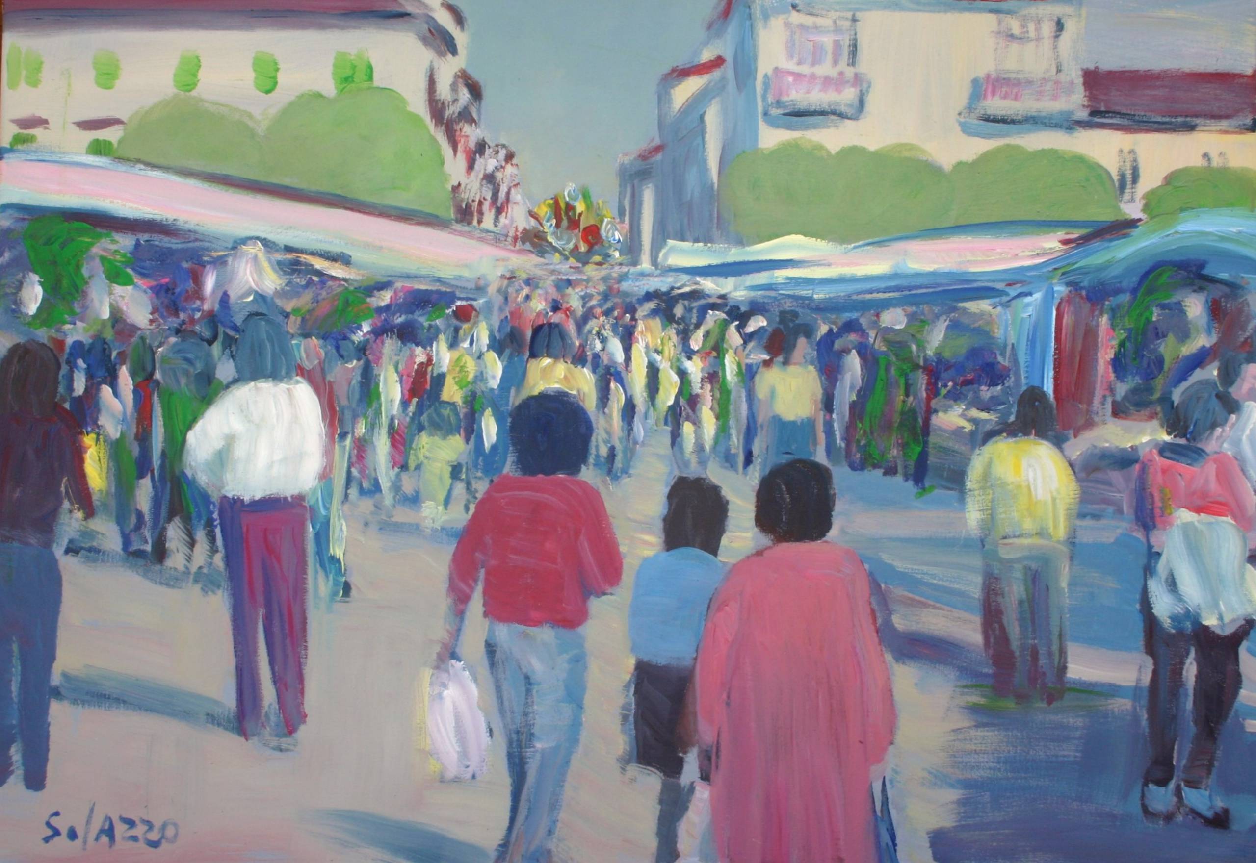 Na obrazie widzimy gwarne targowisko, pełne rozmaitych kolorów i ruchu. Kolory są intensywne i różnorodne, dominują odcienie czerwieni, niebieskiego i zieleni, które tworzą dynamiczną kompozycję. Kształty są rozmyte, co dodaje dziełu swoistej lekkości i impresjonistycznego charakteru. Atmosfera jest żywa i pełna energii, jakbyśmy mogli usłyszeć szmery rozmów i odgłosy targowych przyśpiewek. Artysta używa szerokich pociągnięć pędzla, co nadaje obrazowi płynność i spontaniczność. Styl to połączenie ekspresji i abstrakcji, co sprawia, że widz zanurza się w tej miejskiej scenerii bez wysiłku. Obraz może wywołać w odbiorcy uczucia nostalgii, przypominając chwile spędzone na podobnych targach. A może ktoś poczuje się zainspirowany tą codzienną sceną, pełną prawdziwego życia i interakcji. Spoglądając na ten obraz, myślę sobie: "Wow, ależ tu się dzieje!". Dziecięca percepcja mogłaby opisać to prosto: Ludzie idą przez kolorowy świat! To dzieło z pewnością przyciąga wzrok i intryguje swoją prostotą oraz głębią jednocześnie. Można powiedzieć, że jest po prostu "full of life".