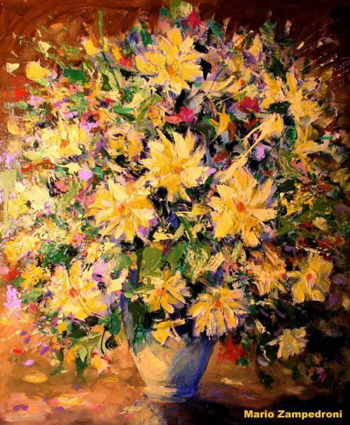 Obraz przedstawia bukiet kwiatów, eksplodujący żywymi kolorami. Żółcień kwiatów dominuje, tworząc wrażenie słońca zamkniętego w wazonie. Obok tego żarzącego się żółtego widnieje zieleń liści, które otaczają centralny motyw jak ramiona roślinnego anioła. Tło pełne jest ciepłych brązów i brzoskwiniowych odcieni, które dodają głębi i harmonii do kompozycji. Nastrój tego dzieła jest niemalże świąteczny, pełen energii i radosnej aury. Rozchlapane pociągnięcia pędzla dodają całości dynamiki, jakby kwiaty tańczyły. Technika impasto, widoczna w grubo nałożonej farbie, pozwala na namacalne doświadczenie tekstury, niemal czujesz zapach tych kwiatów. Co za vibrant touch! Kiedy na to patrzę, mam wrażenie, że czas się zatrzymał. Jakby cała radość wiosny została uchwycona w tym jednym momencie. Świetnie jest zobaczyć, jak artysta potrafi wydobywać tyle emocji z prostego motywu. Obraz przypomina mi ogród pełen tajemniczego życia, w którym każda roślina ma swoją historię do opowiedzenia. "Patrz, mam kwiatek!" - powiedziałby mały dzieciak z błyskiem w oku. Sztuka często ma w sobie coś magicznego. Wszystko tu wygląda jak sen, zatrzymany w przestrzeni i czasie. Można się zatracić. Ale całkiem mi się to podoba.