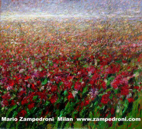 To dzieło eksploduje kolorami, które wręcz przelewają się po płótnie. Dominują ciepłe czerwienie i zielenie, które tworzą gęsty, niemal hipnotyzujący pejzaż kwiatowy. Faktura farby jest tak bogata, że niemal czuć zapach tych rozkwitających marzeń. Widać, że artysta użył grubych pociągnięć pędzlem, co nadaje obrazowi wrażenie ruchu. Sposób, w jaki kolory się mieszają, przypomina życiową dynamikę i niepewność. Obraz emanuje spokojem, ale też ma w sobie jakąś tajemnicę. Jest jednocześnie uspokajający i lekko niepokojący, jakby krył w sobie niespodziankę. Styl impresjonistyczny pozwala na różne interpretacje patrzenia, w zależności od odległości. Kiedy patrzę na to dzieło, przypominam sobie beztroskę dziecięcej wyobraźni. "To jak pole w bajce!" – może powiedzieć dziecko. Emocjonalnie, obraz ma w sobie coś "dreamlike". Czuje się nostalgia i tęsknota za chwilą zatrzymaną w czasie, pełną barw i ciepła.