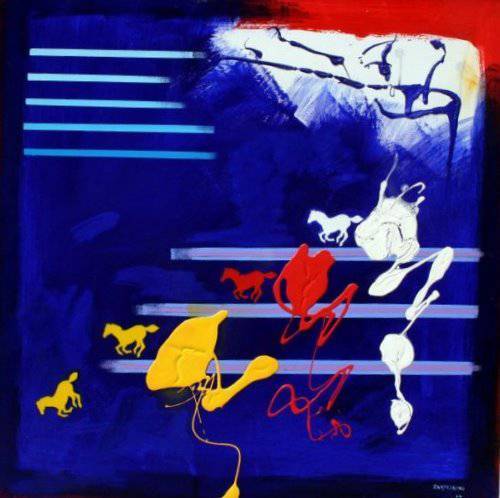 Obraz przedstawia dynamiczną kompozycję pełną żywych kolorów. Dominują intensywne odcienie granatu, czerwieni i żółci. Na pierwszym planie dostrzec można abstrakcyjne kształty przypominające konie, które jakby pędziły w nieznane. Niebieskie linie na górze tworzą niemalże hipnotyzującą perspektywę, prowadząc wzrok w głąb obrazu. Twórczość ta emanuje energią i tajemnicą. Atmosfera jest niemal elektryczna, a jednocześnie wprowadza w stan kontemplacji. Artysta wykorzystał technikę łączenia mocnych barw z delikatnymi liniami, co dodaje głębi i dynamiki. Każdy element zdaje się być w ruchu, jakby obraz mógł ożyć w każdej chwili. To takie "wow" experience, które sprawia, że serce bije szybciej. Styl jest wyraźnie współczesny, korzystający z abstrakcji i gry kolorów. Techniką artystyczną zdaje się być mieszanka płynnych ruchów pędzla i precyzyjnych konturów. Obraz zdaje się krzyczeć o wolność i ekspresję. Może wywoływać u odbiorcy uczucie niepokoju, ale i fascynacji. Zastanawiasz się, co tak naprawdę przedstawia, a może chodzi o przedstawienie ruchu jako symbolu życia? Jakieś smutki, jakieś radości splatają się tutaj w jedno. It's a kind of magic, który sprawia, że stoisz przed tym dziełem zastanawiając się nad jego przekazem. Jedno jest pewne: każda chwila spędzona przed tym obrazem to moment pełen emocji i refleksji, a jego widok na długo zostanie w pamięci.