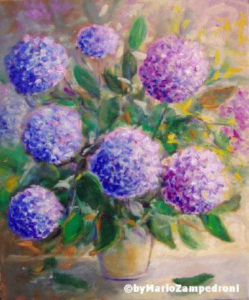 Na obrazie dominuje żywa paleta kolorów, z fioletowymi i niebieskimi kulami hortensji kontrastującymi z zielonymi liśćmi. Kwiaty wydają się niemal trójwymiarowe, dzięki miękkim pociągnięciom pędzla, które tworzą delikatną teksturę. Kompozycja jest symetryczna, z centralnie umieszczonym bukietem, który nadaje harmonii całemu dziełu. Atmosfera obrazu jest spokojna i harmonijna, emanująca ciepłem letniego dnia. Styl malarski przywodzi na myśl impresjonizm, z naciskiem na światło i kolor, które nadaje mu lekkości. Odbiorca może poczuć się zrelaksowany, jakby na chwilę zanurzał się w ogrodowym zaciszu pełnym kwitnących roślin. Technika impastu dodaje dynamiki, sprawiając, że każdy płatek wydaje się żywy. Gdy patrzę na ten obraz, przypomina mi się, jak biegałem po ogrodzie babci. Wow, ale te kwiaty są piękne! Pozornie spontaniczne pociągnięcia pędzla składają się na skomplikowaną mozaikę kolorów i kształtów, które tworzą wrażenie ruchu. To dzieło to nie tylko przedstawienie natury, ale także wyraz emocji i ulotnej chwili. W mojej głowie pojawia się słowo "serenity" opisujące spokój, który czuję patrząc na te hortensje. Każdy pączek zdaje się mówić o pięknie i kruchości życia. I to właśnie sprawia, że obraz staje się czymś więcej niż tylko widokiem kwiatów. To zaproszenie do zastanowienia się nad ulotnością chwil i przyjemnością, jaką możemy czerpać z prostych rzeczy.