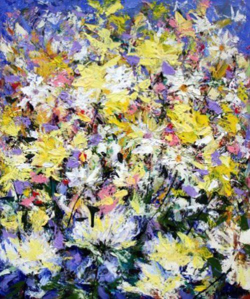 Na obrazie widać eksplozję kolorów. Dominuje intensywna żółć, biel i fiolet, przeplatane odcieniami zieleni oraz różu. Kształty są rozmyte, chaotyczne, niczym chmury kwiatów tańczących na wietrze. Ta kompozycja tworzy poczucie dynamiki i energii. Atmosfera jest pełna radości, jakbyśmy zaglądali do zaczarowanego ogrodu, który ledwo mieści swoją dzikość w ramy obrazu. Całość emanuje aurą wiosennej świeżości i beztroski. Artysta wykorzystał technikę impasto, nanosząc farbę grubymi pociągnięciami pędzla, co dodaje dziełu tekstury i głębi. Ślady pędzla nadają obrazowi dynamiczny, niemalże taneczny rytm. Styl jest swobodny, niemalże abstrakcyjny, co pozwala odbiorcy na indywidualną interpretację, sprawiając, że każdy może zobaczyć coś innego. Wow, jak kolorowo! Patrząc na to dzieło, odczuwam nagły przypływ pozytywnej energii i lekkości. Chaos barw może przypominać dziecięce marzenia pełne beztroski i fantazji. W dodatku, ten obraz może wywołać uśmiech i skojarzenia z ciepłymi dniami spędzonymi na łące pełnej kwiatów. It's absolutely stunning.