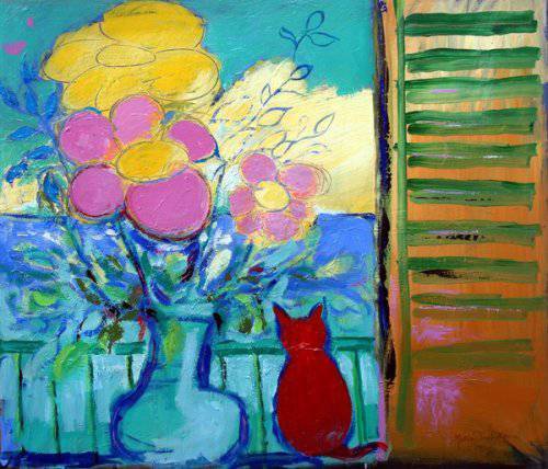 Obraz, który widzisz, to prawdziwy festiwal kolorów. Dominują tutaj żywe żółcie, różowe i niebieskie odcienie, które przyciągają wzrok i budują niepowtarzalną, radosną atmosferę. Na pierwszym planie widzimy wazon pełen kwiatów, które zdają się rozkwitać prosto w stronę słońca. Ich kształty są wyraźnie zarysowane, a liście dodają obrazu subtelności. Obok siedzi czerwona postać kota, patrzącego na świat z boku, dodając obrazie nutkę tajemnicy. Atmosfera obrazu to pełnia radości i błogości. Czyż nie przypomina Wam to letniego popołudnia na tarasie z kubkiem herbaty? Styl artysty jest luźny i ekspresyjny, z widocznymi pociągnięciami pędzla i błędem tu i ówdzie, co dodaje dziełu autentyczności. Technika łączy elementy fauvizmu z nowoczesną swobodą, przekazując emocje poprzez intensywne barwy i odważne linie. Z kolei emocje, które może wywoływać ten obraz, to spokój i ciepło domowego ogniska. Kot może przypominać dzieciństwo, kiedy to takie małe stworzenia były godne zaufania i zawsze tam, gdy ich potrzebujesz. Obraz jest jak "happy place", gdzie możemy przenieść się myślami z dala od zgiełku codzienności. Czuję, że każdy, kto spojrzy na ten obraz, poczuje się jak na szybkim "escape" do bardziej przyjemnej rzeczywistości. To jakby ktoś namalował, jak wygląda szczęście. Zdecydowanie warto na to zerknąć i zaczerpnąć trochę tej fantazji.