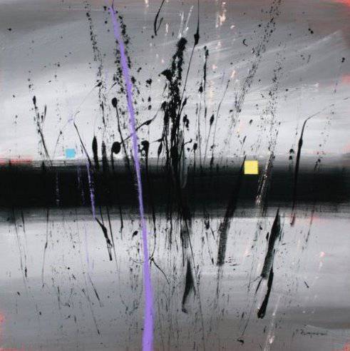 Obraz promienieje tajemniczą atmosferą, która wciąga od pierwszego spojrzenia. Dominuje szarość, przełamana intensywnymi akcentami w postaci fioletowej linii, która wydaje się przełamywać ciszę tła. Czerni i odcienie szarości tworzą głębię, sprawiając wrażenie przestrzeni pełnej nieodgadniona. Na horyzoncie pojawiają się jasne kwadraty w kolorze żółtym i niebieskim, jakby ktoś rzucił kostki na planszę życia, dodając "unexpected" twist. Mimo abstrakcyjnego charakteru, kompozycja jest zbalansowana, jakby artysta chciał uchwycić chaos i harmonię w jednym ujęciu. Smugi i kropki farby sugerują dynamikę, niemal taniec pędzla po płótnie. To jakby burza emocji zamknięta na płaskiej powierzchni. Kiedy patrzę na ten obraz, czuję się jakbym miał podróżować przez myśli artysty, pełne zgiełku i spokoju jednocześnie. Ślady, niczym cieknąca farba, mogą kojarzyć się z deszczem, próbą oczyszczenia, albo ostrym krzykiem w pustkę. Czy to nie przypomina uczucia, kiedy dziecko mówi: "Jakie to fajne plamy!"? Każdy element wydaje się miejscem do refleksji. Technika artysty łączy ekspresjonizm z subtelną abstrakcją. To dzieło wywołuje kalejdoskop emocji, od zaintrygowania po głębsze przemyślenia o tym, co nieznane.