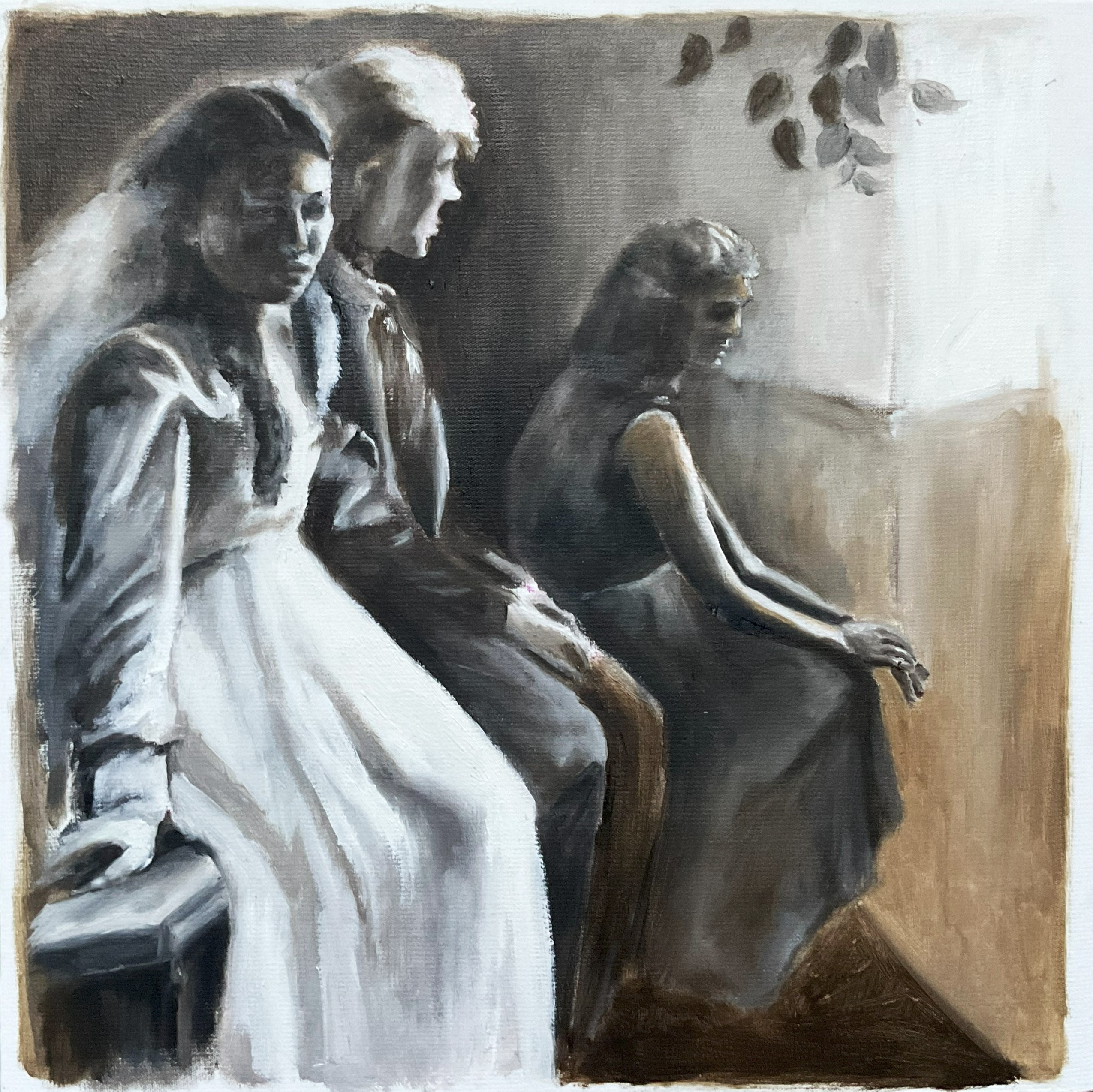 Na obrazie nostalgiczny klimat przenika przez każdy zakamarek. Dominują subtelne odcienie szarości, które przyciągają uwagę do postaci. Trzy osoby siedzą w półmroku, skierowane w stronę źródła światła. Ich sylwetki są rozmyte, tworząc wrażenie ulotności chwili. Kompozycja jest zrównoważona, z naciskiem na delikatną grę światła i cienia. Obraz emanuje spokojem, może wręcz nostalgią. Jest coś nieuchwytnego w ich zamyśleniu. Styl artystyczny wydaje się być inspirowany realizmem. Artysta użył techniki sfumato, mieszając barwy, aby uzyskać miękkie przejścia tonalne. Wyraźnie czuje się melancholię, ale też pewną tajemniczość. Może to nostalgia za przeszłością? Patrząc na to dzieło, odczuwa się wewnętrzny spokój, ale i niepewność co do historii skrytej za tymi postaciami. Każdy widz może poczuć coś innego, bo obraz jest jak okno do innego świata. Kto wie, może jest to refleksja nad przemijaniem chwili, które zatrzymano na płótnie.