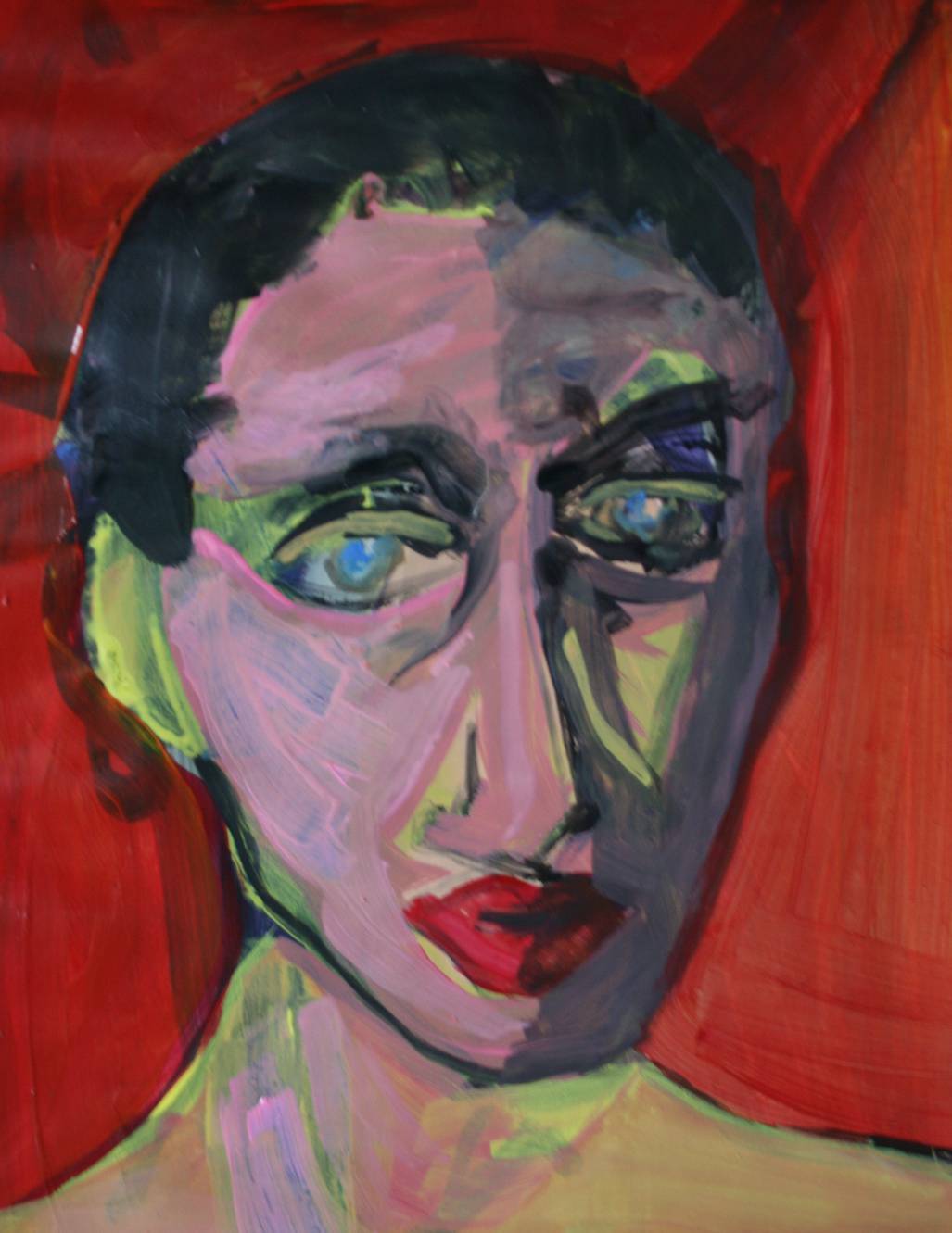 Obraz eksploduje energią intensywnych kolorów. Dominują czerwień i róż, a tęczowe refleksy przeplatają się w kształtach twarzy. Kompozycja jest dynamiczna, twarz wydaje się niemalże poruszać w barwnym chaosie. Atmosfera emanuje niepokojem, unosi się nad nami chmura emocji. To spojrzenie pełne pytań... czujesz to? Artystyczny styl przypomina ekspresjonizm—czysty dynamizm i rytm w każdym pociągnięciu pędzla. Technika jest surowa, niemalże dzika, dodaje głębi i uczucia. Baking two revealing eyes against a crimson background. Dzieło wzbudza różnorakie emocje. Może to smutek, może zagubienie? Każdy dostrzeże coś własnego. Jego spojrzenie wbija się w ciebie, zastanawiasz się, co kryje się za maską farby. Takie obrazy pozostawiają w tobie echo, które nie daje spokoju. "To jest pani z czerwonym kolorem" — tak powiedziałby mały artysta. Czasem chciałoby się zawołać: "Hej, co tu się dzieje!" Wciągające, zaskakujące, a jednak zrozumiałe w swojej emocjonalnej surowości. To obraz, który zostaje z tobą na długo.