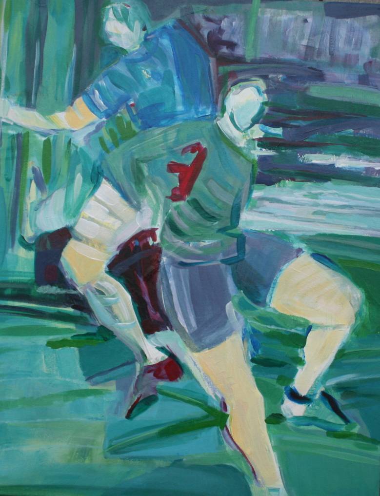 Obraz wiruje w kalejdoskopie zieleni, błękitów i czerwieni. Dwie postacie zanurzone w dynamicznym ruchu, jakby tańczyły na kolorowym tle. Kształty są nieostre, prawie jakby malowane mokrym pędzlem, co dodaje im tajemniczości. Atmosfera jest intensywna, gotowa do wybuchu jak balon na imprezie urodzinowej. Artysta posługuje się techniką impastową, tworząc warstwy farby, które niemal można dotknąć. To wprost magnes na emocje. Całość emanuje energią, ale i chaosem. Jakbyśmy byli świadkami pasjonującego meczu, gdzie czas zastyga na chwilę. Obraz jest jak sportowy thriller – spocone koszulki, napięcie. Widzę tu ślad ekspresjonizmu, ale jednocześnie coś bardziej osobistego, jakby autor przemycał swoje wspomnienia z dzieciństwa. Może to jego ulubiona gra, może nieudane zagranie? Jest w tym coś ekscytującego, a zarazem nostalgicznego. Wzbudza to we mnie wspomnienia, gdy sam biegałem po szkolnym boisku. It's a wild ride. Postacie wydają się niemal cieńmi, ukrytymi za płaszczem kolorów, co pozostawia duże pole dla wyobraźni. Jakby ktoś powiedział: "To nie tylko obraz, to cała historia."