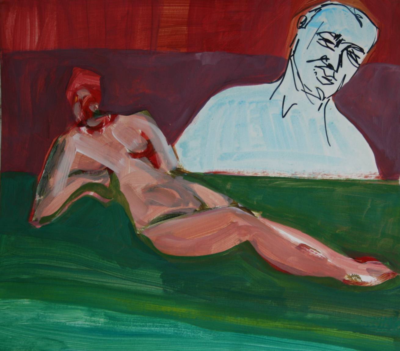 Obraz emanuje intensywnymi barwami, w których dominują czerwień i zieleń, tworząc silny kontrast emocjonalny. Przedstawia postać w pozycji półleżącej, gdzie zarys ciała wydaje się zlewać z tłem. To nie jest obraz realistyczny. Widzę tu grube pociągnięcia pędzla, które nadają dynamiki i pewnej surowości. A co ja tu widzę? Ktoś na hamaku, jakbym miał zgadywać jak dziecko. W tle pojawia się kontur twarzy, narysowany prostymi liniami, jakby na szybko. Ta praca ma coś, co moglibyśmy nazwać "mood" – zamyślona i nieco melancholijna. Technika malarska przypomina nieco ekspresjonizm z uwagi na swobodę formy oraz intensywność kolorów. Patrząc na to dzieło można odczuć pewną niejednoznaczność, zastanowić się, czy to leniwe popołudnie, czy może coś smutniejszego. Obraz zachęca do refleksji, do zadawania pytań o to, co jest pomiędzy widocznym a ukrytym. Może tu jest coś, co wymaga odkrycia. Ale jedno jest pewne – to artwork przyciąga uwagę i pozostaje w pamięci.