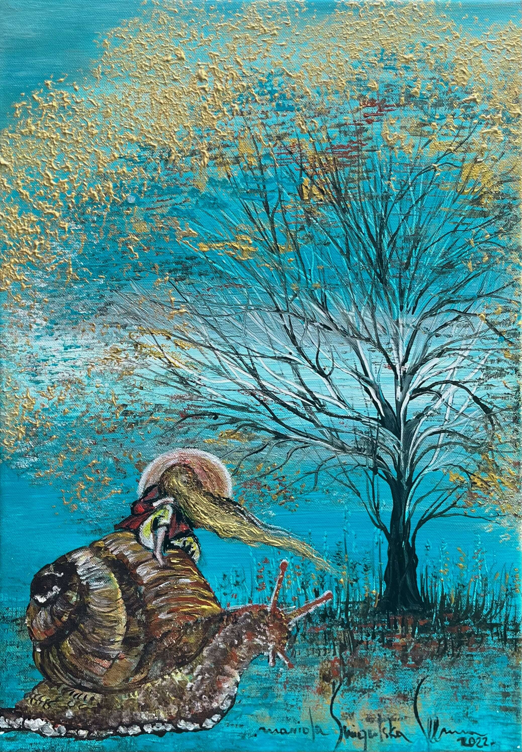 Obraz o wymiarach 55x38x1,5 (cm), namalowany w 2022 r. techniką akrylową na płótnie. Podpis artystki znajdu je się w prawym dolnym rogu - Mariola Świgulska Seenna 2022 r. Tematyką obrazu jest fantastyczny portret znanej baśniowej postaci, któa podróżuje na ślamku. Krawędzie boczne obrazu są zamalowane i estetycznie wykończone. Obraz ze względu na swoje wymiary odnajdzie się doskonale w każdym wnętrzu. Do namalowania obrazu artystka użyła głównie niebieskich farb (błękity, turkusy), złotych (złoto się mieni i odbija światło) oraz brązowych.