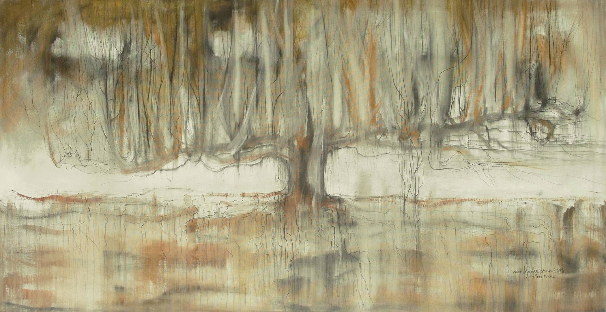 Obraz namalowany w 2011 roku utrzymany w brązowo-białej kolorystyce .Praca ma zamalowane boki, więc nie wymaga oprawy.Dzieło jest sygnowane w prawym dolnym rogu. Idealnie nada się do nowoczesnego wnętrza .