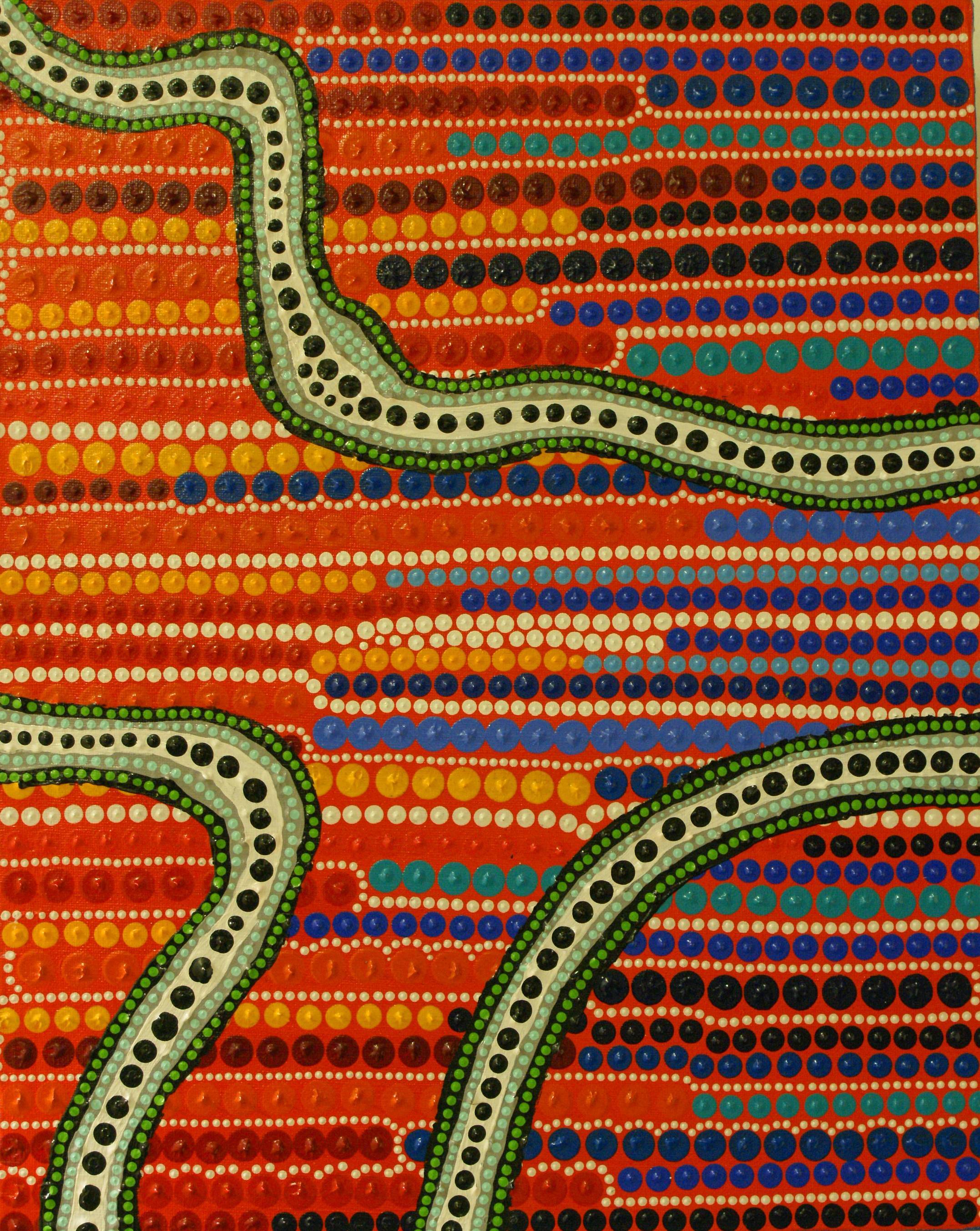 Obraz emanuje bogactwem kolorów i kształtów, dominującą czerwienią przeplataną niebieskimi, zielonymi i żółtymi kropkami, tworzącymi harmonijną kompozycję. Całość przełamuje wijąca się linia, przypominająca zieloną rzekę, kontrastując z pulsującymi kropkami. Atmosfera jest żywa, pełna energii, jakby malarz chciał powiedzieć: patrz, życie toczy się wokół nas. Styl przypominający technikę pointylizmu, gdzie każdy punkt ma swoje znaczenie, zachęca do zagłębienia się w najdrobniejsze detale. Jest coś hipnotyzującego w tym rytmie kolorów, co może wywołać u odbiorcy poczucie zanurzenia w tańczącym świecie przyrody. Obraz przywodzi na myśl dzikość i nieprzewidywalność natury, a jednocześnie spokój. Dzieciak mógłby powiedzieć: "To wygląda jak wesoły potwór w wodzie!". Emocje mieszają się tu z fascynacją i zaskoczeniem — life, pełne barw i sekretów, otwiera przed nami swoje tajemnice. Ten obraz to jak podróż w nieznane, która zachęca do odkrycia czegoś magicznego.