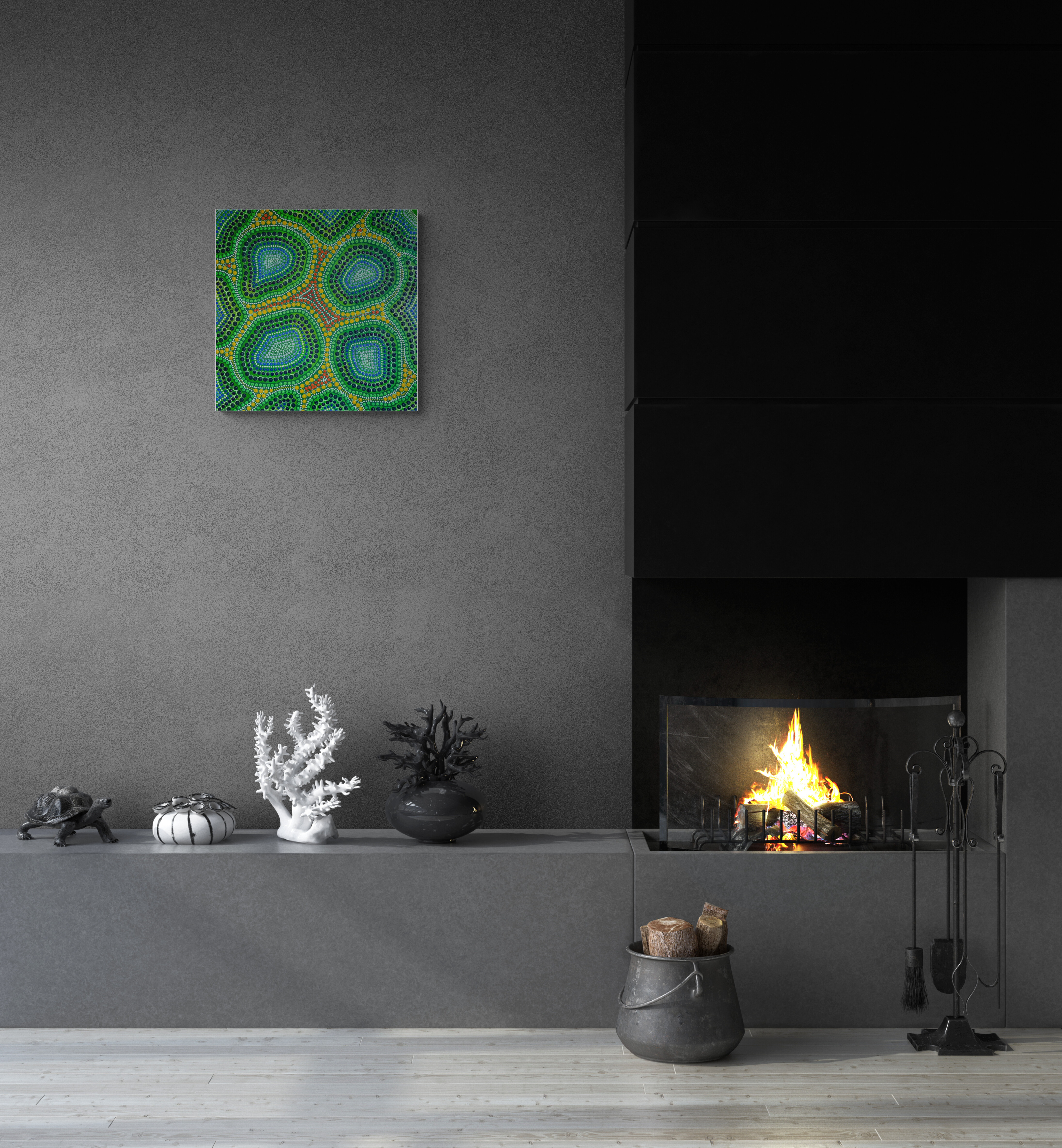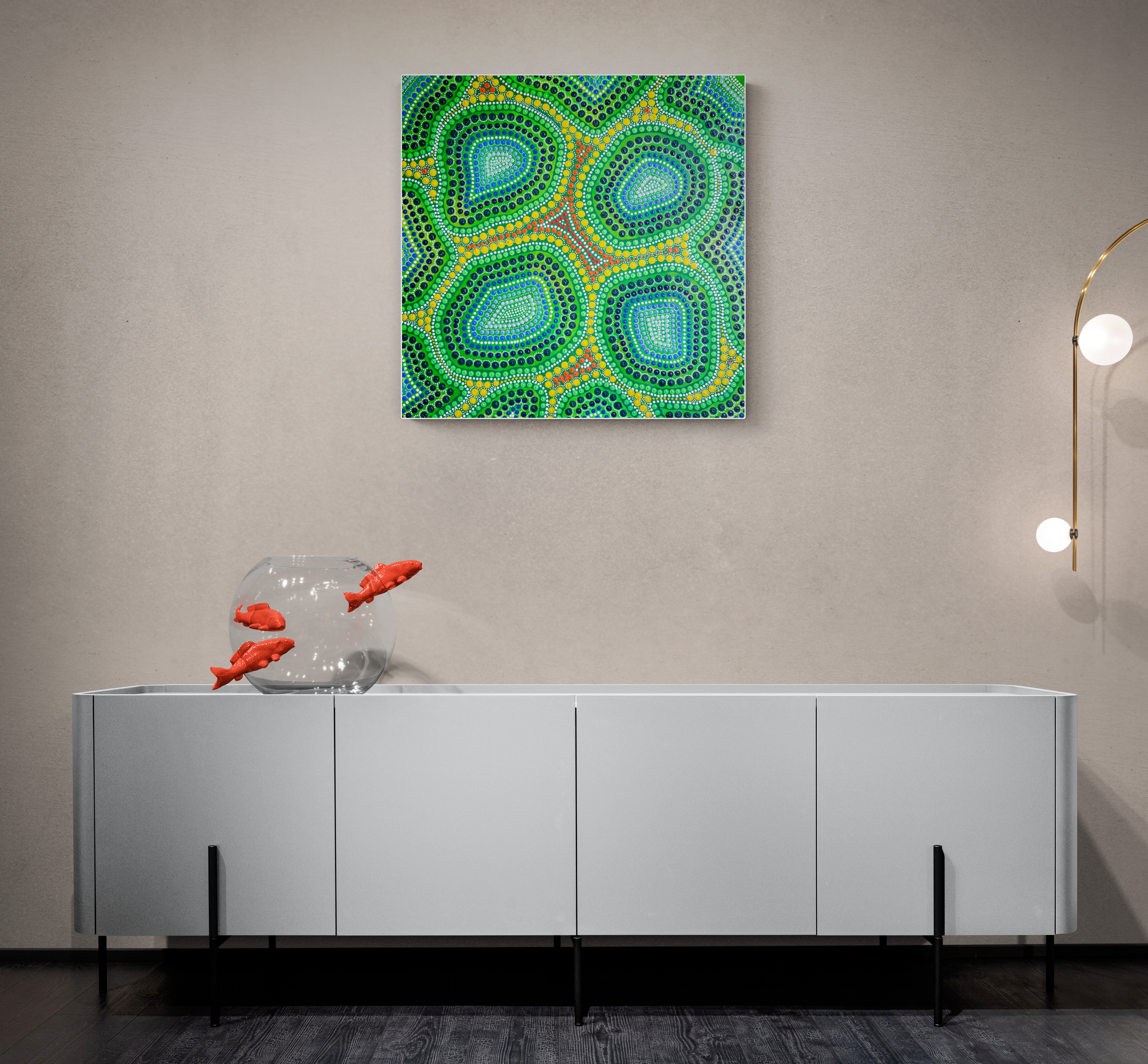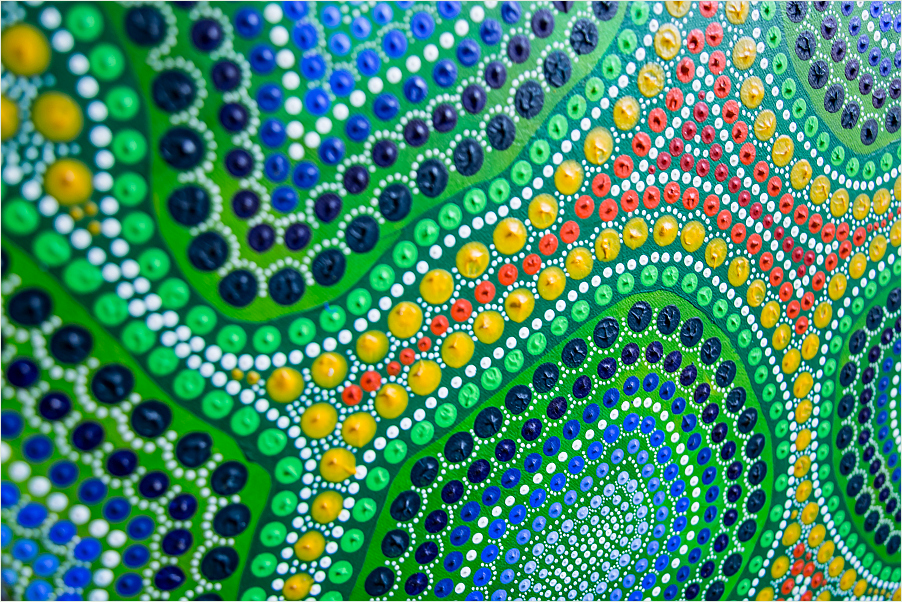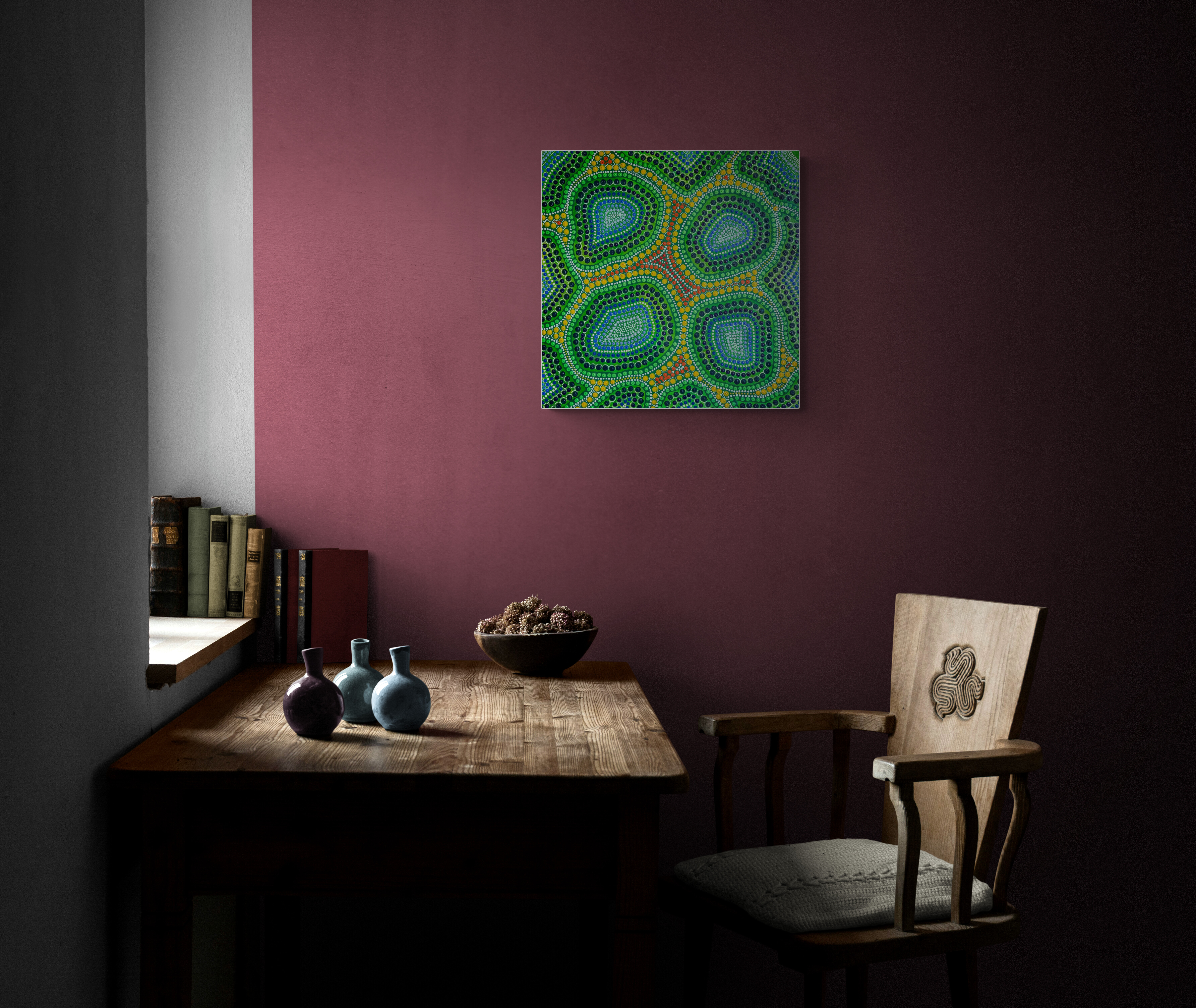 Obraz możesz zainstalować na ścianie wertykalnie lub horyzontalnie. Oto obraz pełen kolorów i życia. Widzimy tu dominantę zieleni, żółci oraz czerwieni. Od pierwszego spojrzenia przyciągają wzrok koliste wzory, które układają się w rytmiczne kompozycje. Wszędzie te małe kropki, które tworzą dynamiczny kalejdoskop form. Detale, choć drobne, są starannie przemyślane. Zielony przeplata się z niebieskim i czarnym, nadając temu dziełu wyrazistość. Wyobraź sobie fale energii, które tańczą po powierzchni. Wow, to naprawdę intrygujące. Atmosfera tego obrazu jest jak magiczny ogród, pełen tajemnic i odkryć. Autorzy Aborygeńscy często stosują takie techniki, znane jako dot painting. Dzięki nim obraz zyskuje unikalny styl, który oddziałuje na widza. Technika kropkowania tworzy wrażenie głębi, a jednocześnie spokoju. Dzieło to jest pełne życia. Budzi w nas różne emocje — od radości po zadumę. Może też przypominać o naturze, symbolizując połączenie wszystkiego z wszystkim. Dla niektórych to zawirowanie kropelek może być wizją kosmiczną. Jak to zobaczysz, to Twoja sprawa. Myślę, że u mnie skutkuje to uśmiechem. Ten obraz jest "an eye-opener", naprawdę. Nie sposób przejść obok niego obojętnie.
