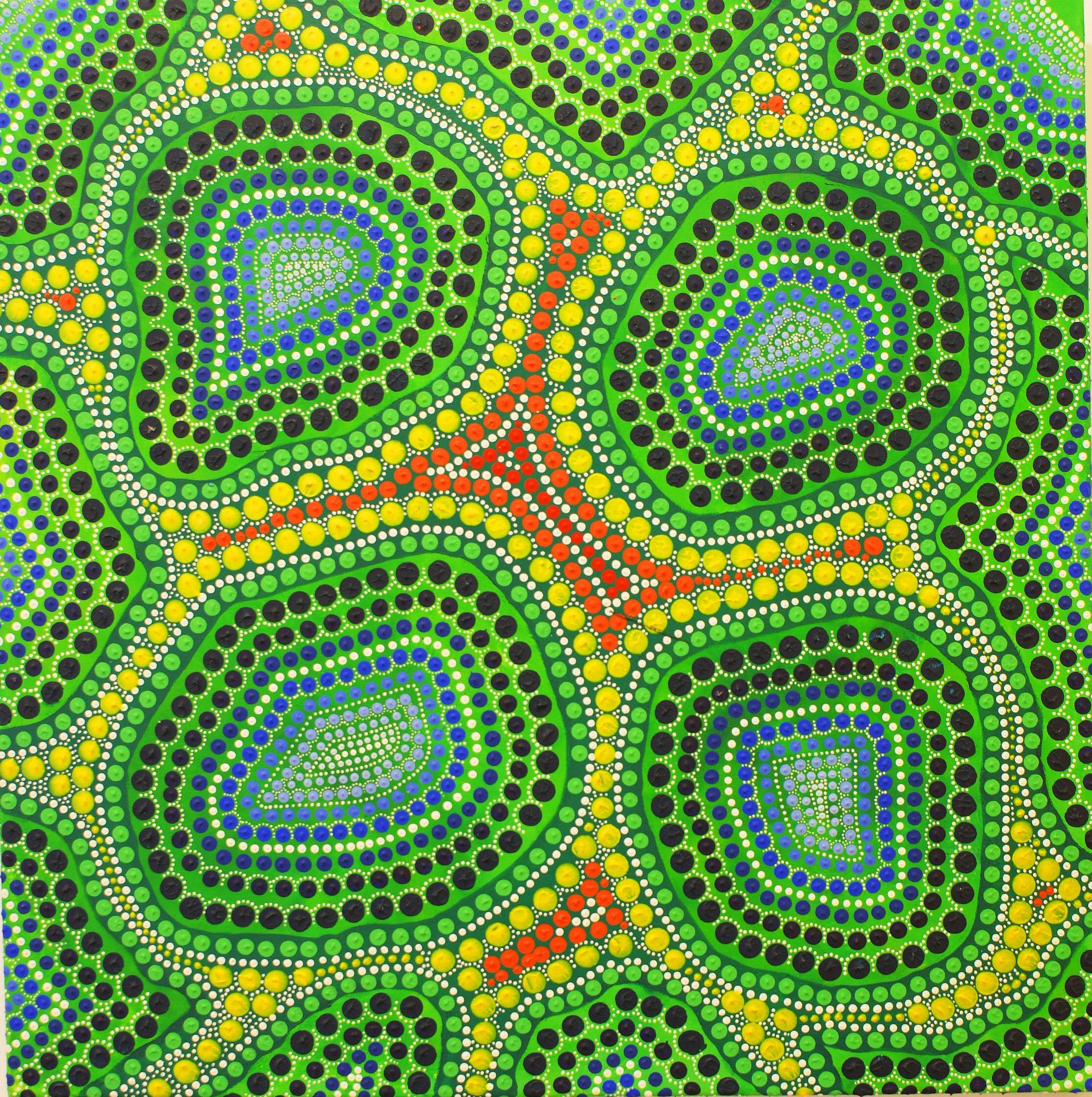 Oto obraz pełen kolorów i życia. Widzimy tu dominantę zieleni, żółci oraz czerwieni. Od pierwszego spojrzenia przyciągają wzrok koliste wzory, które układają się w rytmiczne kompozycje. Wszędzie te małe kropki, które tworzą dynamiczny kalejdoskop form. Detale, choć drobne, są starannie przemyślane. Zielony przeplata się z niebieskim i czarnym, nadając temu dziełu wyrazistość. Wyobraź sobie fale energii, które tańczą po powierzchni. Wow, to naprawdę intrygujące. Atmosfera tego obrazu jest jak magiczny ogród, pełen tajemnic i odkryć. Autorzy Aborygeńscy często stosują takie techniki, znane jako dot painting. Dzięki nim obraz zyskuje unikalny styl, który oddziałuje na widza. Technika kropkowania tworzy wrażenie głębi, a jednocześnie spokoju. Dzieło to jest pełne życia. Budzi w nas różne emocje — od radości po zadumę. Może też przypominać o naturze, symbolizując połączenie wszystkiego z wszystkim. Dla niektórych to zawirowanie kropelek może być wizją kosmiczną. Jak to zobaczysz, to Twoja sprawa. Myślę, że u mnie skutkuje to uśmiechem. Ten obraz jest "an eye-opener", naprawdę. Nie sposób przejść obok niego obojętnie.