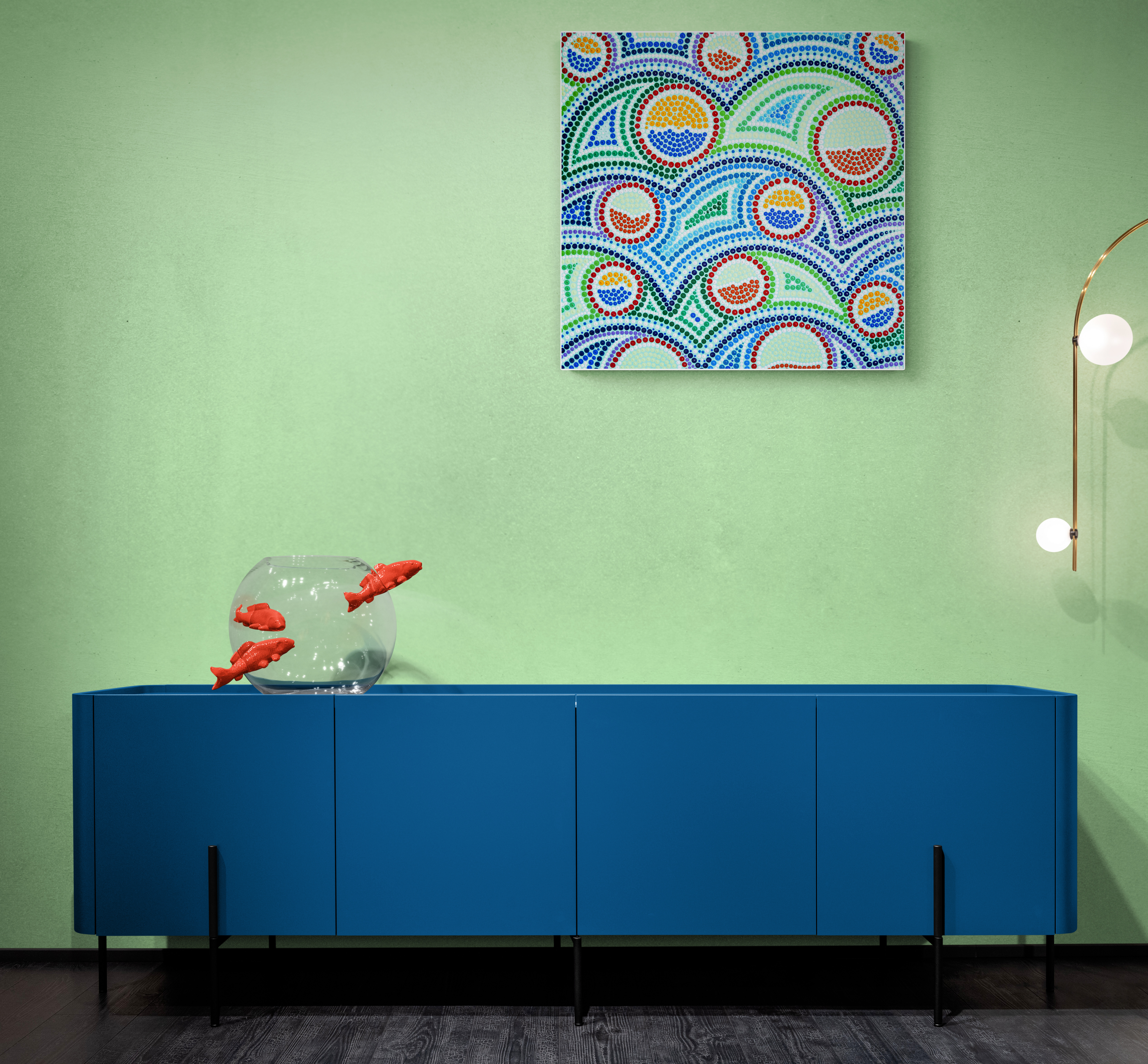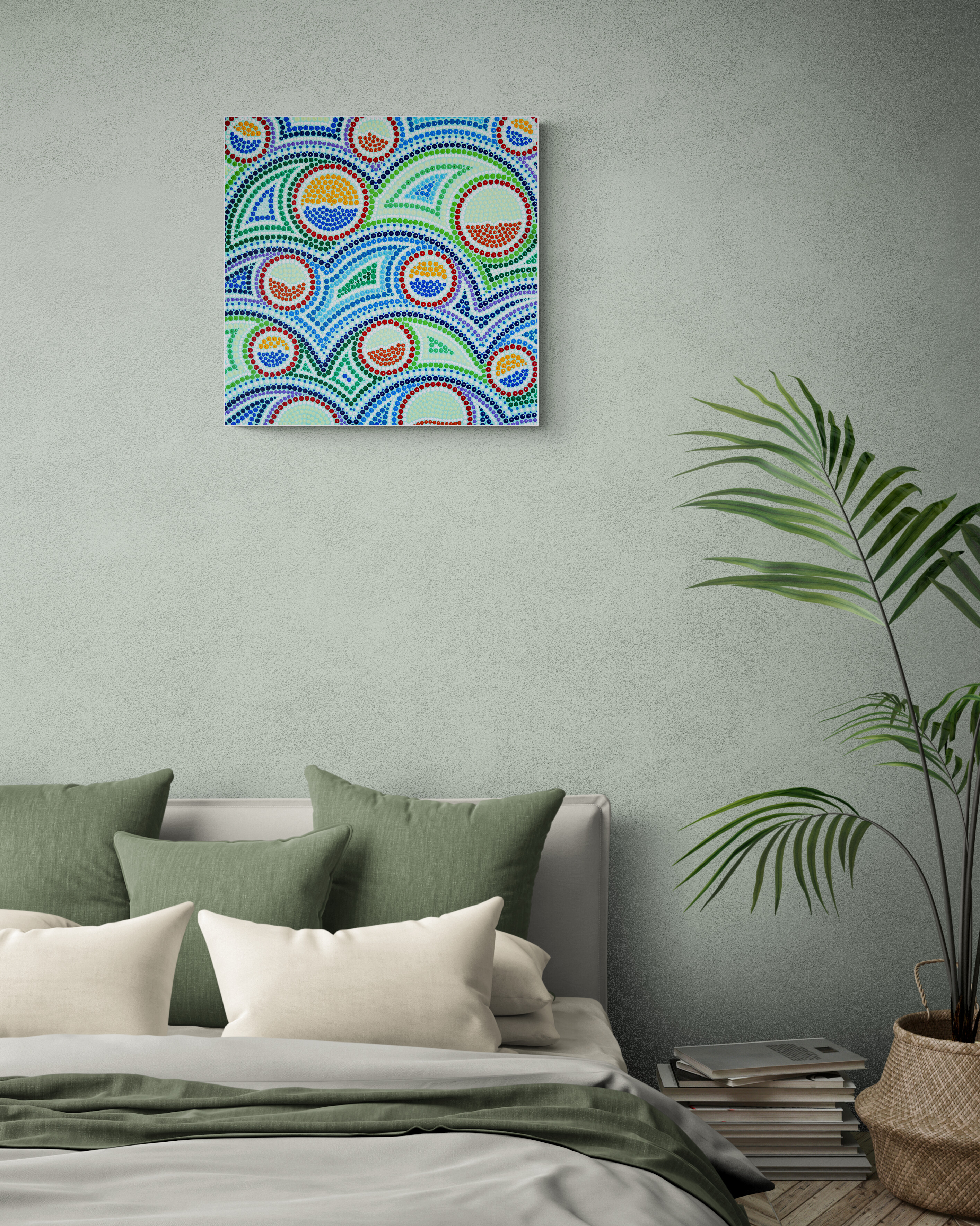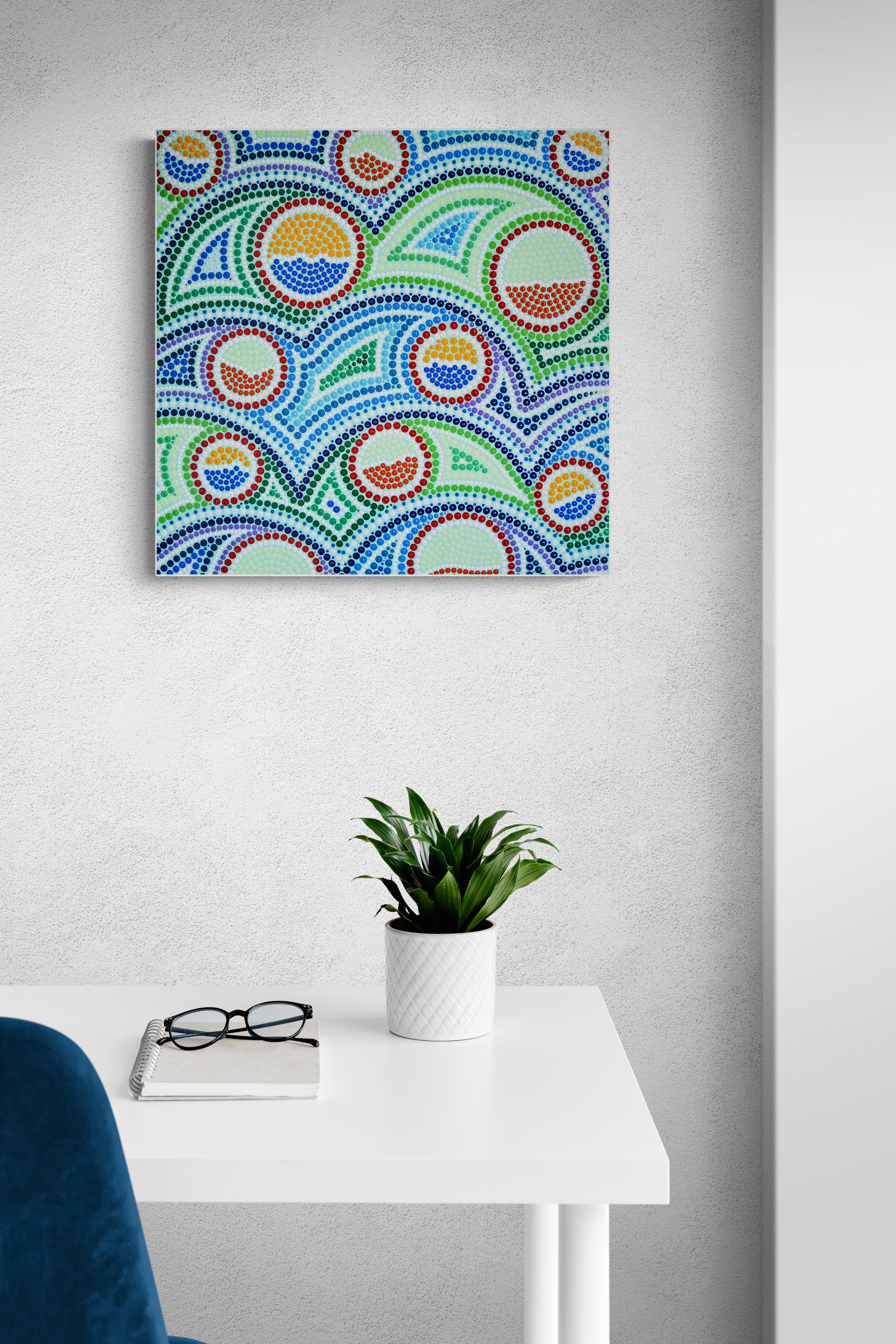 Obraz możesz zainstalować na ścianie wertykalnie lub horyzontalnie. Ten obrazek wybucha kolorami jak fajerwerki na nocnym niebie. Zielone i niebieskie pasy przeplatają się z energetycznymi, ciepłymi czerwonymi i pomarańczowymi punktami. Kolory są jakby żywe i tańczące, tworzą dynamiczną kompozycję pełną krągłych kształtów. Artysta zastosował technikę pointylizmu, wykorzystując drobne kropki do zbudowania większej całości, co dodaje obrazowi tekstury i głębi. Czujesz, jakbyś patrzył na coś w ruchu. Atmosfera jest radosna i optymistyczna, jak ciepły letni dzień. Kropki są jak małe bąbelki szczęścia. Obraz może przypominać widoki krajobrazu z lotu ptaka albo może być abstrakcją, która zachęca do własnej interpretacji. Kiedy patrzysz na niego, czujesz jakąś wewnętrzną radość, a jednocześnie spokój. Malowanie tym stylem wymaga cierpliwości i precyzji, ale efekt końcowy to czysta magiczna eksplozja. Look closer, mówi ten obraz, a zobaczysz więcej. Co więcej, obraz jest tak pełen energii i koloru, że aż chce się do niego podskoczyć. Może wywołać u widza szeroki uśmiech i chęć zanurzenia się w nim bez reszty. Jakby życie było prostsze niż się wydaje. Nawet dziecko by powiedziało: "To jak zabawa w kropki!". Czasem sztuka przemawia bez słów, a ten obraz mówi w wyjątkowy sposób, oddziałując na emocje i wyobraźnię. Coś pięknego!