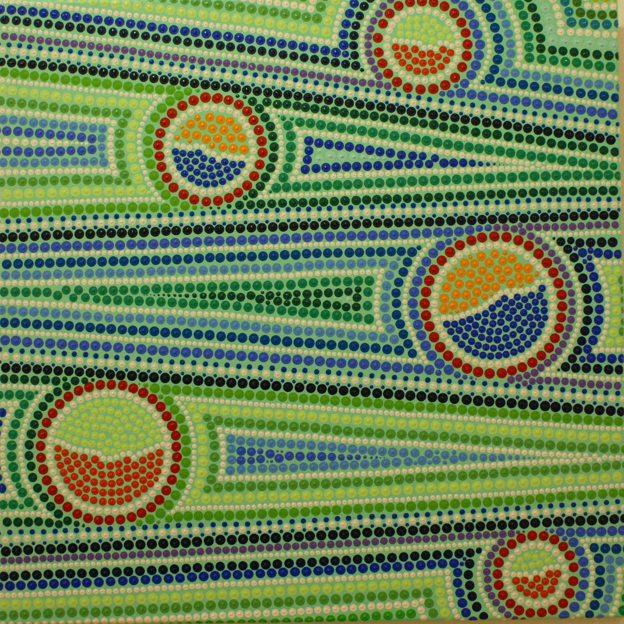 Ten obrazek wybucha kolorami jak fajerwerki na nocnym niebie. Zielone i niebieskie pasy przeplatają się z energetycznymi, ciepłymi czerwonymi i pomarańczowymi punktami. Kolory są jakby żywe i tańczące, tworzą dynamiczną kompozycję pełną krągłych kształtów. Artysta zastosował technikę pointylizmu, wykorzystując drobne kropki do zbudowania większej całości, co dodaje obrazowi tekstury i głębi. Czujesz, jakbyś patrzył na coś w ruchu. Atmosfera jest radosna i optymistyczna, jak ciepły letni dzień. Kropki są jak małe bąbelki szczęścia. Obraz może przypominać widoki krajobrazu z lotu ptaka albo może być abstrakcją, która zachęca do własnej interpretacji. Kiedy patrzysz na niego, czujesz jakąś wewnętrzną radość, a jednocześnie spokój. Malowanie tym stylem wymaga cierpliwości i precyzji, ale efekt końcowy to czysta magiczna eksplozja. Look closer, mówi ten obraz, a zobaczysz więcej. Co więcej, obraz jest tak pełen energii i koloru, że aż chce się do niego podskoczyć. Może wywołać u widza szeroki uśmiech i chęć zanurzenia się w nim bez reszty. Jakby życie było prostsze niż się wydaje. Nawet dziecko by powiedziało: "To jak zabawa w kropki!". Czasem sztuka przemawia bez słów, a ten obraz mówi w wyjątkowy sposób, oddziałując na emocje i wyobraźnię. Coś pięknego!