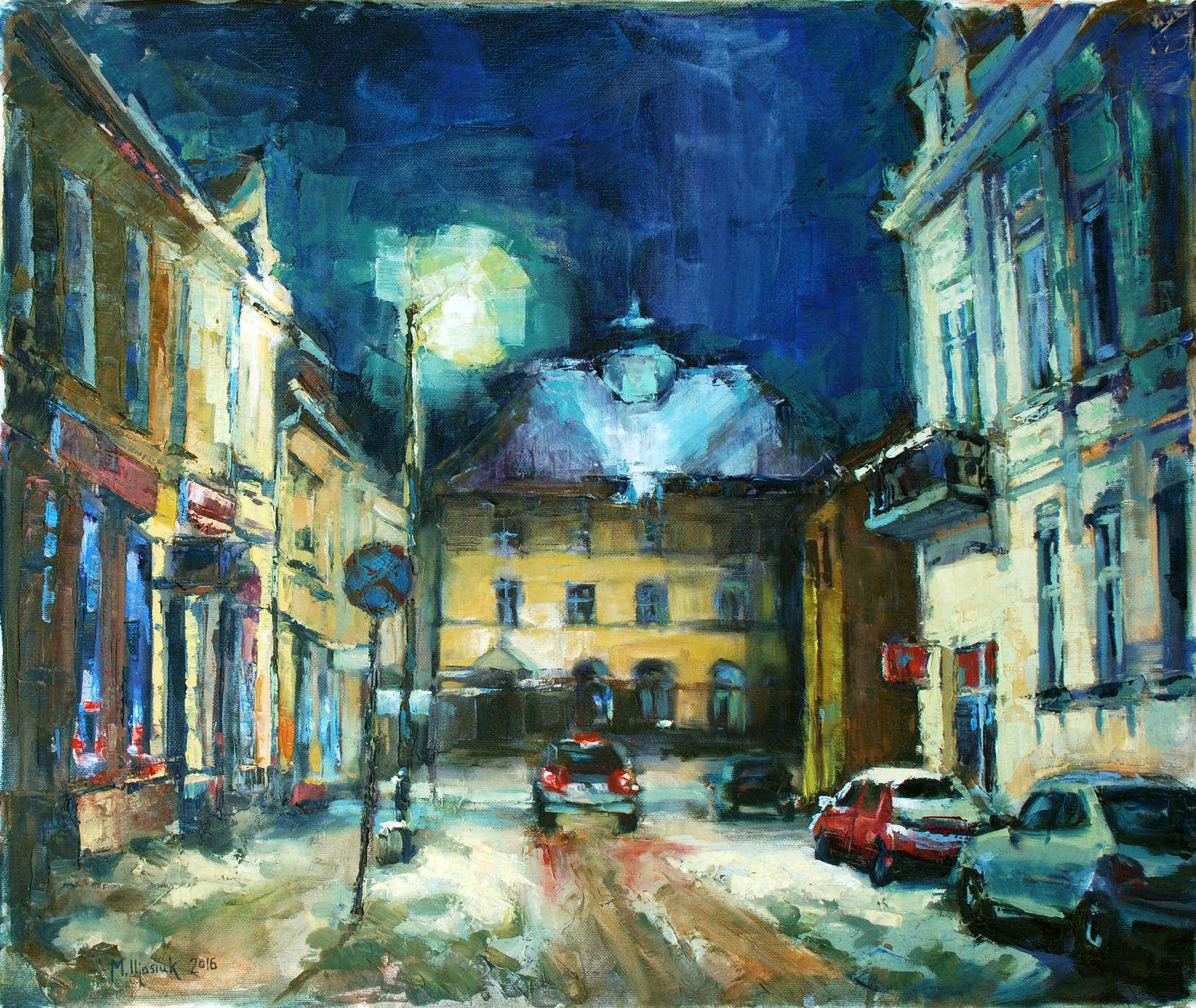 Obraz przedstawia warmińskie miasteczko Biskupiec a dokładniej ulicę Pionierów. W głębi budynek dawnego ratusza miejskiego. Obraz oprawiony w prostą dębową ramę.