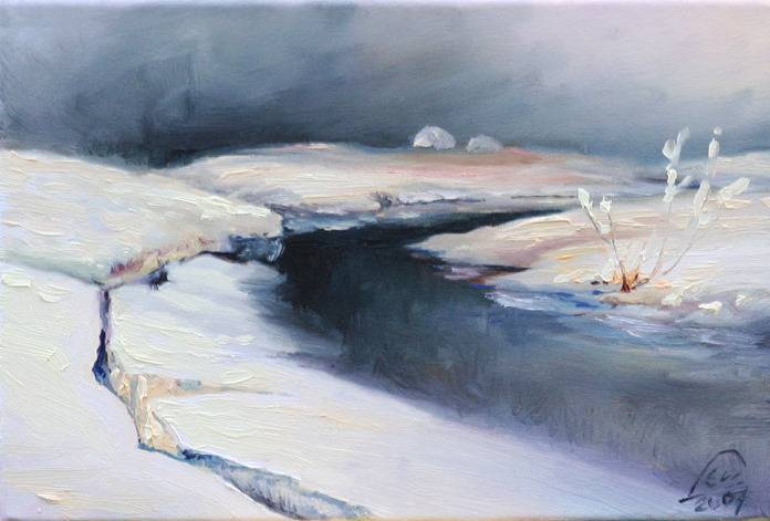 Na obrazie widzimy zimowy krajobraz przedstawiający spokojny strumień przecinający pokryty śniegiem teren. Dominuje paleta zimnych błękitów i szarości z subtelnymi akcentami białego. Śnieg wydaje się delikatny, niemal puszysty, a jego miękkość kontrastuje z ciemnymi, wijącymi się wodami strumienia. W tle, gdzie niebo styka się z ziemią, majaczą bardziej szare plamy chmur, podkreślając uczucie odosobnienia. Atmosfera obrazu jest niemalże melancholijna, jakby czas zatrzymał się w tej chwili ciszy i spokoju. Artysta, używając luźnych, czasem niedbałych pociągnięć pędzla, oddał nie tylko fizyczność krajobrazu, ale i jego emocjonalne oddziaływanie. Coś jakby loneliness. Czy to brzmi trochę smutno? Może tak, ale to taki niewymuszony spokój. Styl jest raczej impresjonistyczny; widzimy, że malarz skoncentrował się na oddaniu wrażeń, a nie szczegółowej dokładności. Technika ta pozwala odbiorcy poczuć uczucia, jakie mógł czuć twórca, stojąc w tym zimowym krajobrazie. "Śnieg jest taki fajny!", mogłoby powiedzieć dziecko patrząc na tę scenę. Moje pierwsze wrażenie? Czułam spokój, ale i lekką tęsknotę za ciepłem. To jeden z tych obrazów, które sprawiają, że zastanawiasz się nad ulotnością chwil i pięknem ich prostoty.