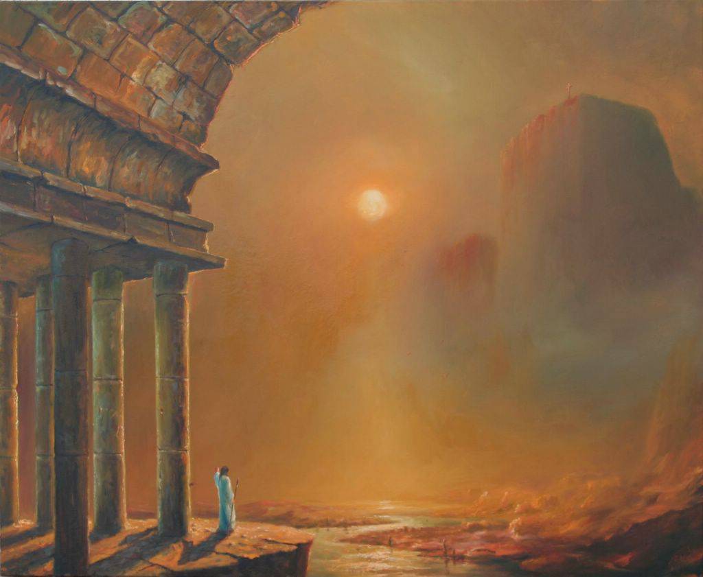 Obraz przedstawia tajemniczy krajobraz, w którym dominuje ciepła paleta odcieni – przeważają tu brązy i pomarańcze, nadające całości aurę nostalgii. Monumentalne kolumny po lewej stronie wznoszą się ku górze, niczym starożytny relikt pozostawiony przez zapomnianą cywilizację. Ich ciężkie, surowe kształty kontrastują z delikatnością tła, w którym słońce subtelnie przebija się przez mgłę. Kompozycja obrazu skłania do zadumy i refleksji. Nastrój płynący z dzieła jest nieco melancholijny, jakby czas się zatrzymał, a rzeczywistość tańczyła pomiędzy snem a jawą. Styl jest impresjonistyczny, z miękkimi, rozmytymi konturami, które dodają głębi i tajemniczości. Patrząc na ten obraz, czuję jak ogarnia mnie spokój, ale też dziwny rodzaj tęsknoty za czymś nieosiągalnym. Może to jest planet Mars? Kolumny stoją niczym latarnie, a postać w błękitnych szatach dodaje nutki ludzkiego dramatyzmu. Czuć w tym "artworku" powiew epickości i nieugiętej wizji przyszłości. To miejsce wydaje się jak z bajki, gdzie wszystko jest możliwe. Inspiruje mnie do tworzenia moich własnych opowieści i ucieczki w świat wyobraźni.